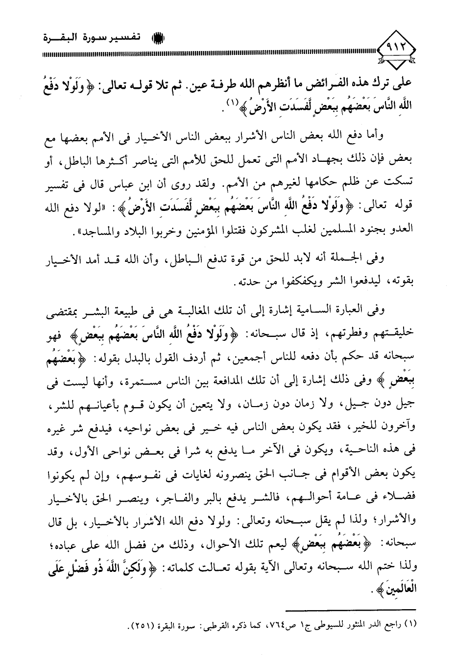وفى العبارة السامية إشارة إلى أن تلك المغالبة هي في طبيعة البشر بمقتضى خليقتهم وفطرتهم، إذ قال سبحانه: (وَلَوْلا دَفْعُ اللَّهِ النَّاسَ بَعْضَهُم بِبَعْضٍ) فهو سبحانه قد حكم بأن دفعه للناس أجمعين، ثم أردف القول بالبدل بقوله: (بَعْضَهُم بِبَعضٍ) وفي ذلك إشارة إلى أن تلك المدافعة بين الناس مستمرة، وأنها ليست في جيل دون جيل، ولا زمان دون زمان، ولا يتعين أن يكون قوم بأعيانهم للشر، وآخرون للخير، فقد يكون بعض الناس فيه خير في بعض نواحيه، فيدفع شر غيره في هذه الناحية، ويكون في الآخر ما يدفع به شرا في بعض نواحي الأول، وقد يكون بعض الأقوام في جانب الحق ينصرونه لغايات في نفوسهم، وإن لم يكونوا فضلاء في عامة أحوالهم، فالشر يدفع بالبر والفاجر، وينصر الحق بالأخيار والأشرار، ولذا لم يقل سبحانه وتعالى: ولولا دفع الله الأشرار بالأخيار، بل قال سبحانه: (بَعْضَهُم بِبَعْضٍ) ليعم تلك الأحوال، وذلك من فضل الله على عباده؛ ولذا ختم الله سبحانه وتعالى الآية بقوله تعالت كلماته: (وَلَكِنَّ اللَّهَ ذُو فَضْلٍ عَلَى الْعَالَمِينَ).