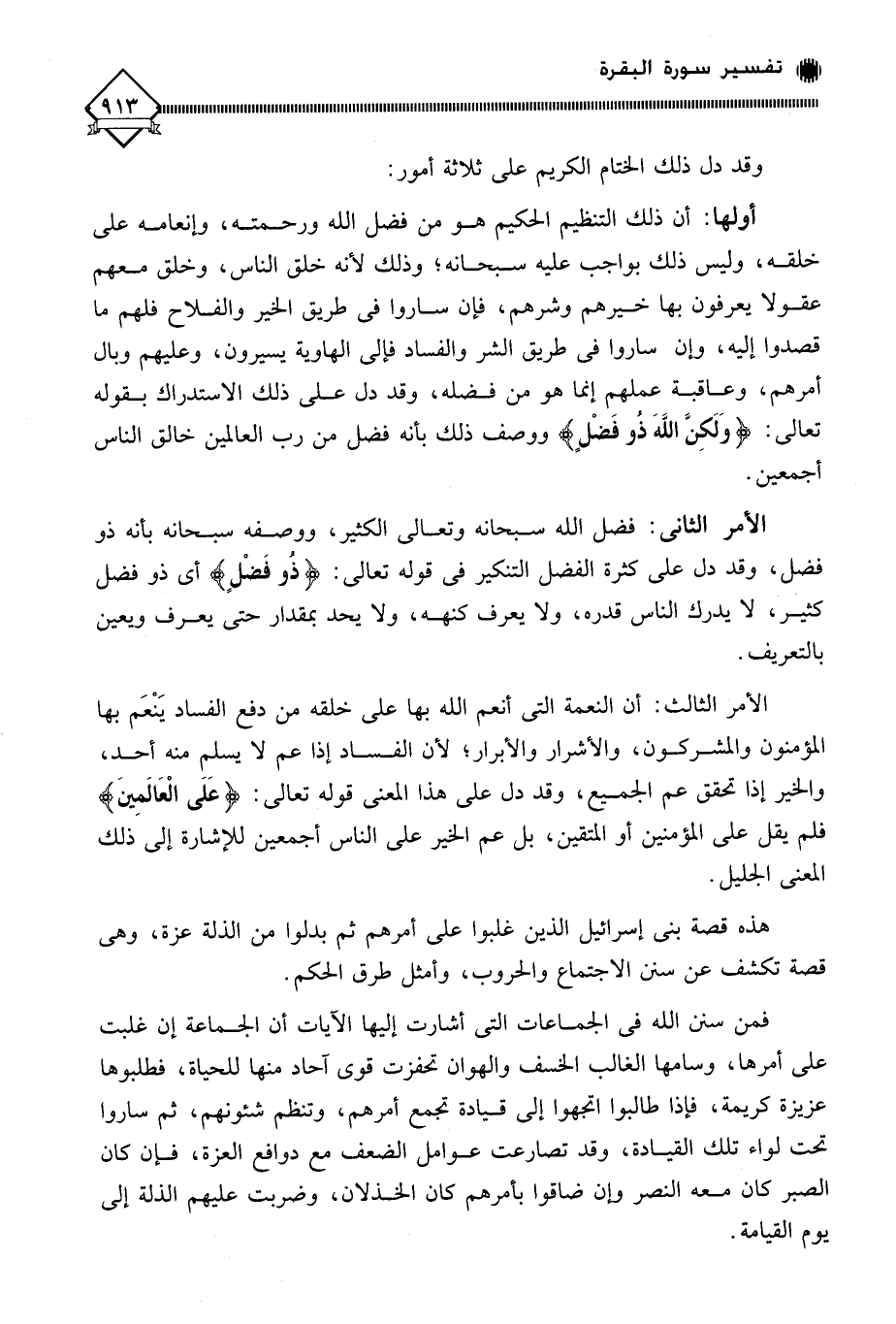 أولها: أن ذلك التنظيم الحكيم هو من فضل الله ورحمته، وإنعامه على خلقه، وليس ذلك بواجب عليه سبحانه؛ وذلك لأنه خلق الناس، وخلق معهم عقولا يعرفون بها خيرهم وشرهم، فإن ساروا في طريق الخير والفلاح فلهم ما قصدوا إليه، وإن ساروا في طريق الشر والفساد فإلى الهاوية يسيرون، وعليهم وبال أمرهم، وعاقبة عملهم إنما هو من فضله، وقد دل على ذلك الاستدراك بقوله تعالى: (وَلَكِن اللَّهَ ذُو فَضْلٍ) وصف ذلك بأنه فضل من رب العالمين خالق الناس أجمعين.