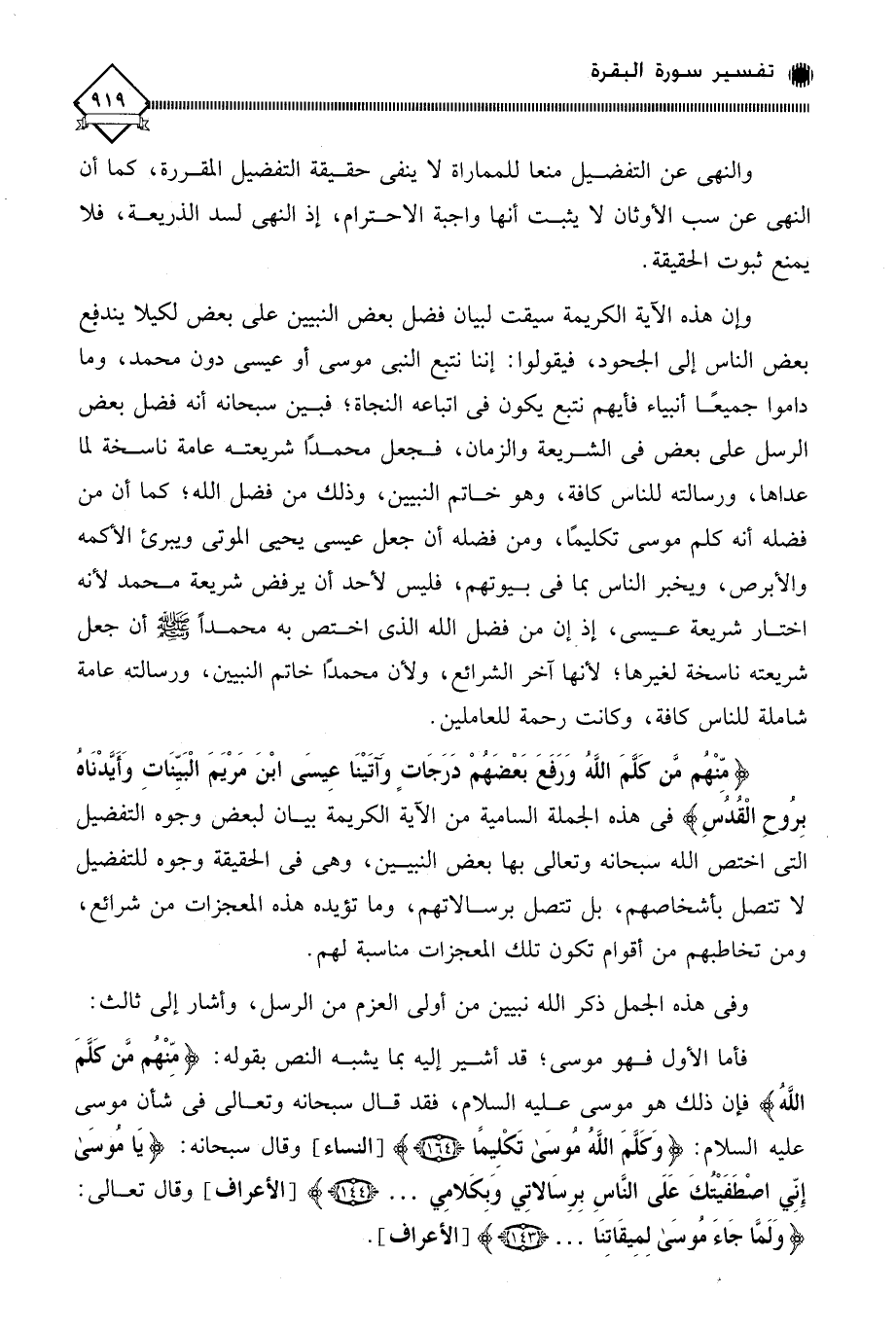 (مِنْهُمْ مَنْ كَلَّمَ اللَّهُ وَرَفَعَ بَعْضَهُمْ دَرَجَاتٍ وَآتَيْنَا عِيسَى ابْنَ مَرْيَمَ الْبَيِّنَاتِ وَأَيَّدْنَاهُ بِرُوحِ الْقُدُسِ) في هذه الجملة السامية من الآية الكريمة بيان لبعض وجوه التفضيل التي اختص الله سبحانه وتعالى بها بعض النبيين، وهي في الحقيقة وجوه للتفضيل لا تتصل بأشخاصهم، بل تتصل برسالاتهم، وما تؤيده هذه المعجزات من شرائع، ومن تخاطبهم من أقوام تكون تلك المعجزات مناسبة لهم.