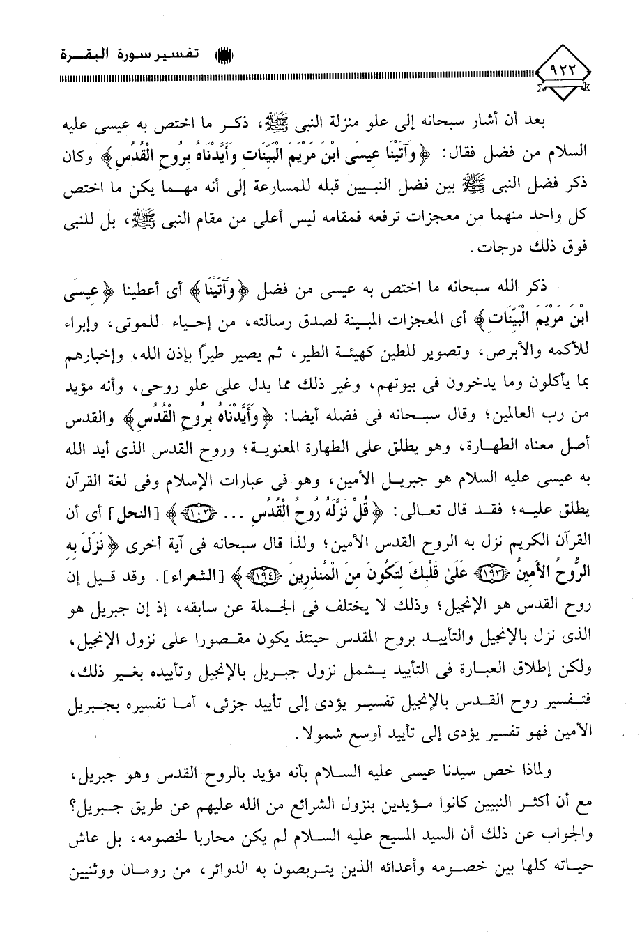 ذكر الله سبحانه ما اختص به عيسى من فضل (وَآتَيْنَا) أي أعطينا (عِيسَى ابْنَ مَرْيَمَ الْبَيِّنَاتِ) أي المعجزات المبينة لصدق رسالته، من إحياء للموتى، وإبراء للأكمه والأبرص، وتصوير للطين كهيئة الطير، ثم يصير طيرًا بإذن الله، وإخبارهم بما يأكلون وما يدخرون في بيوتهم، وغير ذلك مما يدل على علو روحي، وأنه مؤيد من رب العالمين، وقال سبحانه في فضله أيضا: (وَأَيَّدْنَاهُ بِرُوحِ الْقُدُسِ) والقدس أصل معناه الطهارة، وهو يطلق على الطهارة المعنوية، وروح القدس الذي أيد الله به عيسى عليه السلام هو جبريل الأمين، وهو في عبارات الإسلام وفي لغة القرآن يطلق عليه؛ فقد قال تعالى: (قُلْ نَزَّلَهُ رُوحُ الْقُدُسِ. . .)، أي أن القرآن الكريم نزل به الروح القدس الأمين، ولذا قال سبحانه في آية أخرى (نَزَلَ بِهِ الرُّوحُ الأَمِين عَلَى قَلْبِكَ لِتَكُونَ مِنَ الْمُنذِرِينَ). وقد قيل إن روح القدس هو الإنجيل؛ وذلك لَا يختلف في الجملة عن سابقه، إذ إن جبريل هو الذي نزل بالإنجيل والتأييد بروح المقدس حينئذ يكون مقصورا على نزول الإنجيل، ولكن إطلاق العبارة في التأييد يشمل نزول جبريل بالإنجيل وتأييده بغير ذلك، فتفسير روح القدس بالإنجيل تفسير يؤدي إلى تأييد جزئي، أما تفسيره بجبريل الأمين فهو تفسير يؤدي إلى تأييد أوسع شمولا.