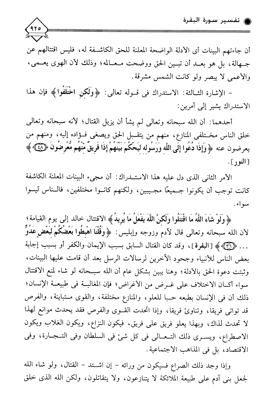 (وَلَوْ شَاءَ اللَّهُ مَا اقْتَتَلُوا وَلَكِنَّ اللَّهَ يَفْعَلُ مَا يُرِيدُ) الاقتتال خالد إلى يوم القيامة، لأن الله سبحانه وتعالى قال لآدم وزوجه وإبليس: (وَقُلْنَا اهْبِطُوا بَعْضُكُمْ لِبَعْضٍ عَدُوٌّ. . .)، وقد كان القتال السابق بسبب الإيمان. والكفر أو بسبب إجابة بعض الناس للأنبياء وجحود الآخرين لرسالات الرسل بعد أن قامت عليها البينات، وثبتت دعوة الحق بالأدلة؛ وهنا يبين بشكل عام أن الله سبحانه لو شاء لمنع الاقتال سواء أكان الاختلاف على غرض من الأغراض، فإن المغالبة في طبيعة الإنسان؛ ذلك أن في الإنسان بطبعه حبًّا للعلو، والمنازع مختلفة، والقوى متباينة، والفرص قد تواتي فريقا، وتناوي فريقا، وإذا اتحدت القوى والفرص فقد يحدث موانع لهذا لا تحدث لذاك، وبهذا يعلو فريق على فريق، فيكون النزاع، ويكون الغلاب ويكون الاصطراع، ويسري ذلك التعالي في كل شيء في السلطان وفي التجارة، وفي الاقتصاد، بل في الذاهب الاجتماعية.