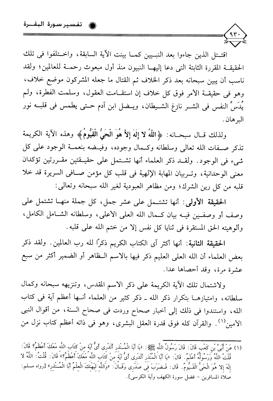 ولاشتمال تلك الآية الكريمة على ذكر الاسم المقدس، وتنزيهه سبحانه وكمال سلطانه، وامتيازها بتكرار ذكر الله - ذكر كثير من العلماء أنها أعظم آية في كتاب الله، واستندوا في ذلك إلى أخبار صحاح وردت في صحاح السنة، من أقوال النبي الأمين (¬1). والقرآن كله فوق قدرة العقل البشرى، وهو في ذاته أعظم كتاب نزل من