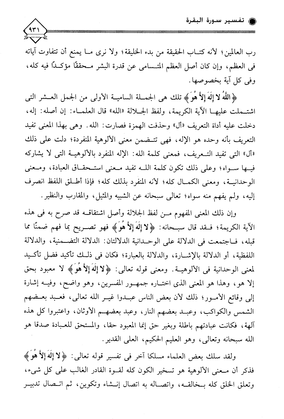 وإن ذلك المعنى المفهوم من لفظ الجلالة وأصل اشتقاقه قد صرح به في هذه الآية الكريمة، فقد قال سبحانه: (لا إِلَهَ إِلَّا هُوَ) فهو تصريح بما فهم ضمنًا مما قبله، فاجتمعت في الدلالة على الوحدانية الدلالتان: الدلالة التضمنية، والدلالة اللفظية، أو الدلالة بالإشارة، والدلالة بالعبارة، فكان في ذلك تأكيد فضل تأكيد لمعنى الوحدانية في الألوهية. ومعنى قوله تعالى: (لا إِلَهَ إِلَّا هُوَ) لَا معبود بحق إلا هو، وهذا هو المعنى الذي اختاره جمهور المفسرين، وهو واضح، وفيه إشارة إلى وقائع الأمور، ذلك لأن بعض الناس عبدوا غير الله تعالى، فعبد بعضهم الشمس والكواكب، وعبد بعضهم النار، وعبد بعضهم الأوثان، واعتبروا كل هذه آلهة، فكانت عبادتهم باطلة وبغير حق إنما المعبود حقا، والمستحق للعبادة صدقا هو الله سبحانه وتعالى، وهو العليم الحكيم، العلي القدير.