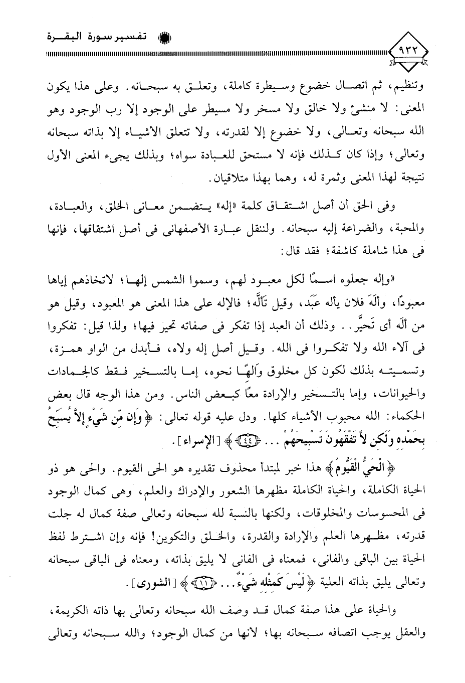 (الْحَيُّ الْقَيُّومُ) هذا خبر لمبتدأ محذوف تقديره هو الحي القيوم. والحي هو ذو الحياة الكاملة، والحياة الكاملة مظهرها الشعور والإدراك والعلم، وهي كمال الوجود في المحسوسات والمخلوقات، ولكنها بالنسبة لله سبحانه وتعالى صفة كمال له جلت قدرته، مظهرها العلم والإرادة والقدرة، والخلق والتكوين! فإنه وإن اشترط لفظ الحياة بين الباقي والفاني، فمعناه في الفاني لَا يليق بذاته، ومعناه في الباقي سبحانه وتعالى يليق بذاته العلية (لَيْسَ كَمِثْلِهِ شَيْءٌ. . .).