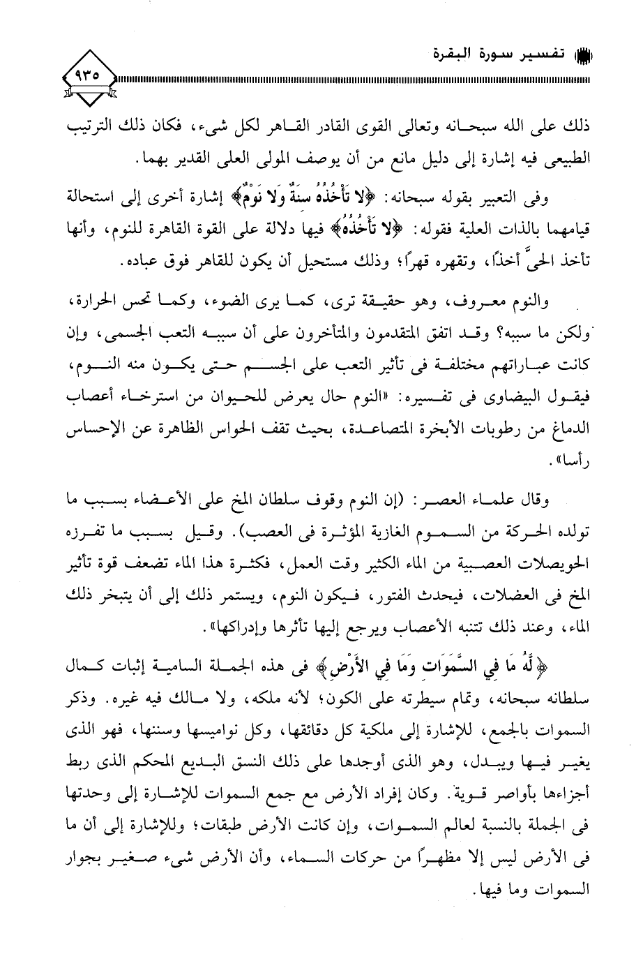 وفى التعبير بقوله سبحانه: (لا تَأْخُذُهُ سِنَةٌ وَلا نَوْمٌ) إشارة أخرى إلى استحالة قيامهما بالذات العلية فقوله: (لا تَأْخُذُهُ) فيها دلالة على القوة القاهرة للنوم، وأنها تأخذ الحيَّ أخذًا، وتقهره قهرًا، وذلك مستحيل أن يكون للقاهر فوق عباده.