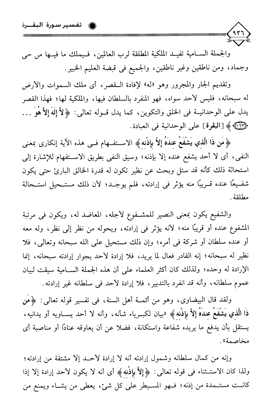 ولقد قال البيضاوي، وهو من أئمة أهل السنة، في تفسير قوله تعالى: (مَن ذَا الَّذِي يَشْفَعُ عِندَهُ إِلَّا بِإِذْنِهِ) " بيان لكبرياء شأنه، وأنه لَا أحد يساويه أو يدانيه، يستقل بأن يدفع ما يريده شفاعة واستكانة، فضلا عن أن يعاوقه عنادًا أو مناصبة أي مخاصمة ".