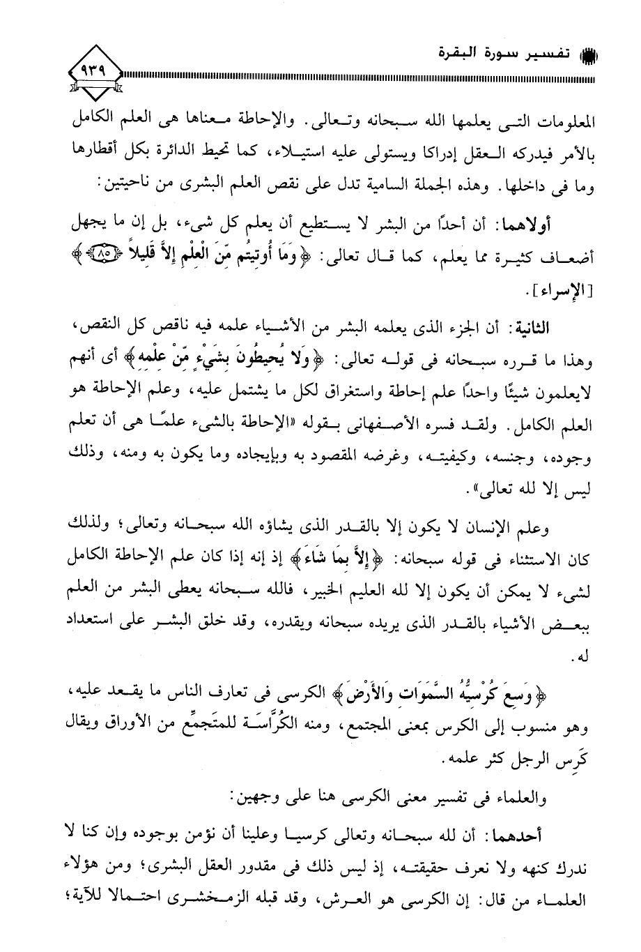 (وَسِعَ كُرْسِيُّهُ السَّمَاوَاتِ وَالأَرْضَ) الكرسي في تعارف الناس ما يقعد عليه، وهو منسوب إلى الكرس بمعنى المجتمع، ومنه الكُرَّاسَة للمتَجمِّع من الأوراق ويقال كَرِس الرجل كثر علمه.