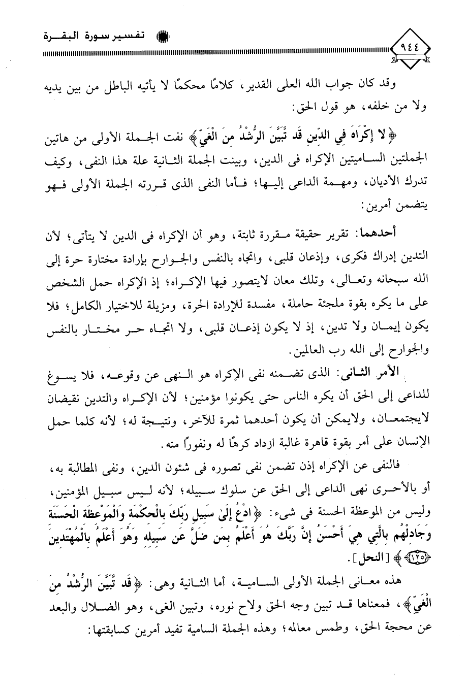 فالنفي عن الإكراه إذن تضمن نفي تصوره في شئون الدين، ونفي المطالبة به، أو بالأحرى نهي الداعي إلى الحق عن سلوك سبيله؛ لأنه ليس سبيل المؤمنين، وليس من الموعظة الحسنة في شيء: (ادْعُ إِلَى سَبِيلِ رَبِّكَ بِالْحِكْمَةِ وَالْمَوْعِظَةِ الْحَسَنَةِ وَجَادلْهُم بِالَّتِي هِيَ أَحْسَنُ إِنَّ رَبَّكَ هُوَ أَعْلَمُ بِمن ضَلَّ عَن سَبِيلِه وَهُوَ أَعْلَمُ بالْمُهْتَدينَ).