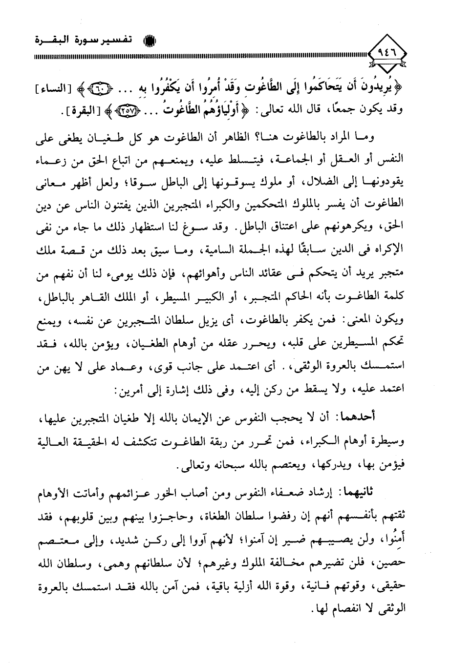 وما المراد بالطاغوت هنا؛ الظاهر أن الطاغوت هو كل طغيان يطغى على النفس أو العقل أو الجماعة، فيتسلط عليه، ويمنعهم من اتباع الحق من زعماء يقودونها إلى الضلال، أو ملوك يسوقونها إلى الباطل سوقا؛ ولعل أظهر معاني الطاغوت أن يفسر بالملوك المتحكمين والكبراء المتجبرين الذين يفتنون الناس عن دين الحق، ويكرهونهم على اعتناق الباطل. وقد سوغ لنا استظهار ذلك ما جاء من نفي الإكراه في الدين سابقًا لهذه الجملة السامية، وما سيق بعد ذلك من قصة ملك متجبر يريد أن يتحكم في عقائد الناس وأهوائهم، فإن ذلك يومئ لنا أن نفهم من كلمة الطاغوت بأنه الحاكم المتجبر، أو الكبير المسيطر، أو الملك القاهر بالباطل، ويكون المعنى: فمن يكفر بالطاغوت، أي يزيل سلطان المتجبرين عن نفسه، ويمنع تحكم المسيطرين على قلبه، ويحرر عقله من أوهام الطغيان، ويؤمن بالله، فقد استمسك بالعروة الوثقى. أي اعتمد على جانب قوي، وعماد على لَا يهن من اعتمد عليه، ولا يسقط من ركن إليه، وفي ذلك إشارة إلى أمرين: