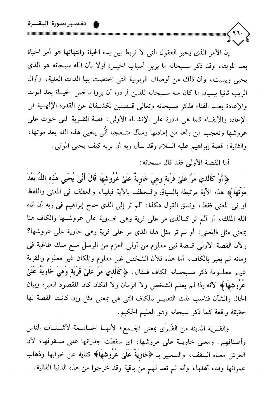 إن الأمر الذي يحير العقول التي لَا تربط بين بدء الحياة وانتهائها هو أمر الحياة بعد الموت، وقد ذكر سبحانه ما يزيل أسباب الحيرة أولاً بأن الله سبحانه هو الذي يحيي ويميت، وأن ذلك من أوصاف الربوبية التي اختصت بها الذات العلية، وأزال الريب ثانيا ببيان ما كان منه سبحانه للذين أرادوا أن يروا بالحس الحياة بعد الموت والإعادة بعد الفناء فذكر سبحانه وتعالى قصتين تكشفان عن القدرة الإلهية في الإعادة والإبقاء كما هي قادرة على الإنشاء الأول: قصة القرية التي خوت على عروشها وتعجب من رآها من إعادتها وسأل متعجبا (أَنَّى يُحْيِي هَذِهِ اللَّهُ بَعْدَ مَوْتِهَا)، والثانية: قصة إبراهيم عليه السلام وقد سأل ربه أن يريه كيف يحي الموتى.