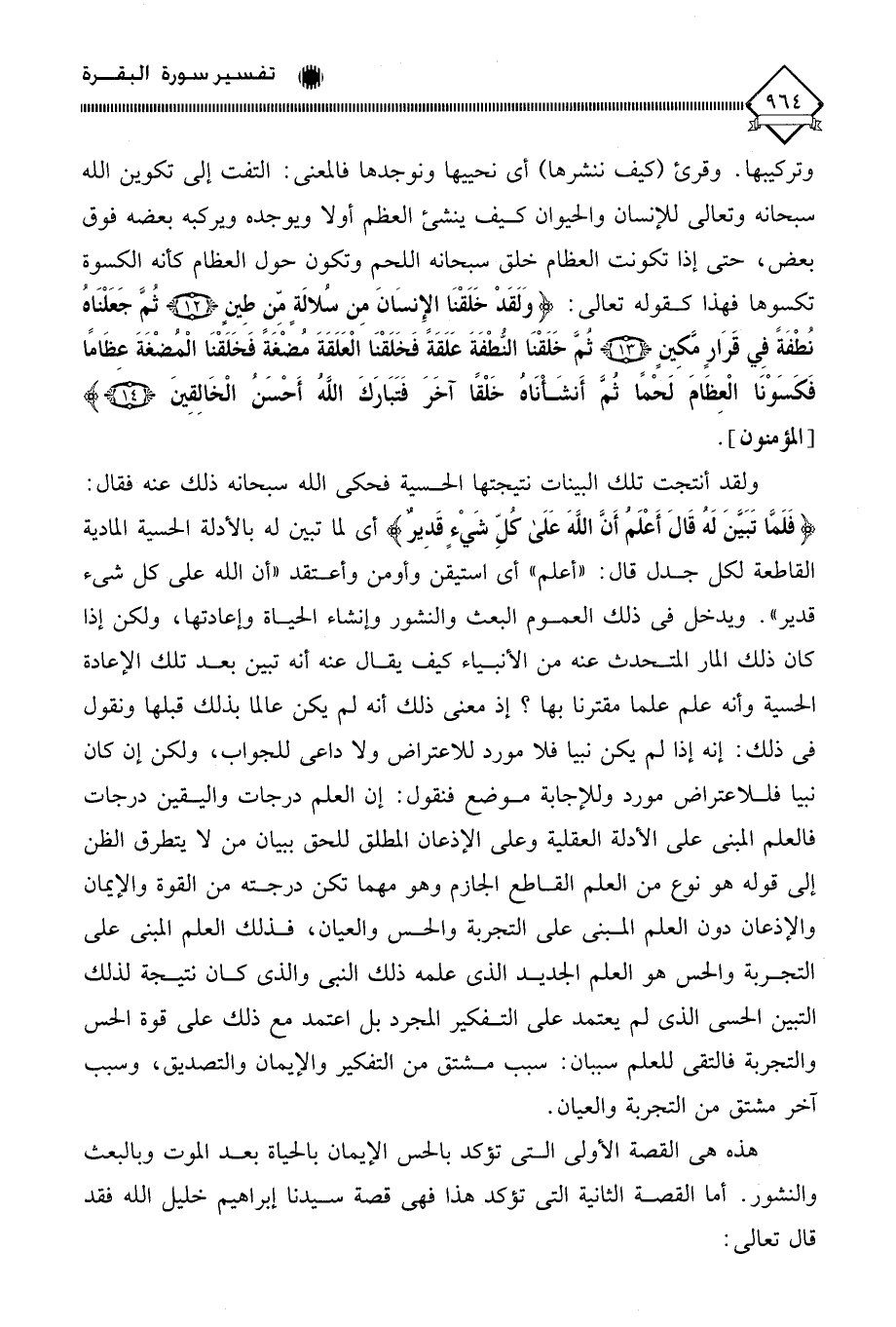 (فَلَمَّا تَبَيَّنَ لَهُ قَالَ أَعْلَمُ أَنَّ اللَّهَ عَلَى كُلِّ شَيْءٍ قَدِيرٌ) أي لما تبين له بالأدلة الحسية المادية القاطعة لكل جدل قال: " أعلم " أي استيقن وأومن وأعتقد " أن الله على كل شيء قدير ". ويدخل في ذلك العموم البعث والنشور وإنشاء الحياة وإعادتها، ولكن إذا كان ذلك المار المتحدث عنه من الأنبياء كيف يقال عنه أنه تبين بعد تلك الإعادة الحسية وأنه علم علما مقترنا بها؛ إذ معنى ذلك أنه لم يكن عالما بذلك قبلها؟ ونقول في ذلك: إنه إذا لم يكن نبيا فلا مورد للاعتراض ولا داعي للجواب، ولكن إن كان نبيا فللاعتراض مورد وللإجابة موضع فنقول: إن العلم درجات واليقين درجات فالعلم المبني على الأدلة العقلية وعلى الإذعان المطلق للحق ببيان من لَا يتطرق الظن إلى قوله هو نوع من العلم القاطع الجازم وهو مهما تكن درجته من القوة والإيمان والإذعان دون العلم المبني على التجربة والحس والعيان، فذلك العلم المبني على التجربة والحس هو العلم الجديد الذي علمه ذلك النبي والذي كان نتيجة لذلك التبين الحسي الذي لم يعتمد على التفكير المجرد بل اعتمد مع ذلك على قوة الحس والتجربة فالتقى للعلم سببان: سبب مشتق من التفكير والإيمان والتصديق، وسبب آخر مشتق من التجربة والعيان.