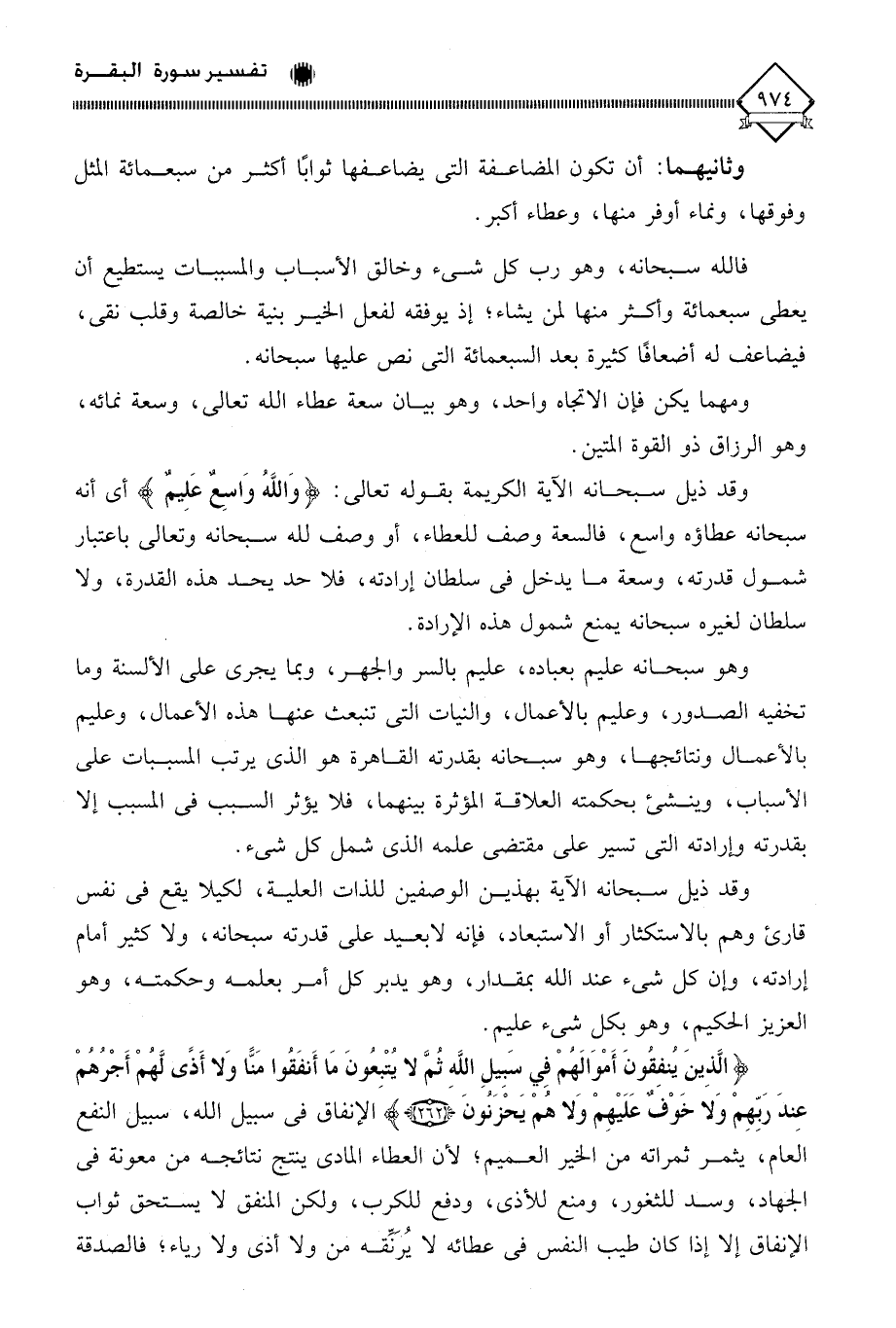 (الَّذِينَ يُنْفِقُونَ أَمْوَالَهُمْ فِي سَبِيلِ اللَّهِ ثُمَّ لَا يُتْبِعُونَ مَا أَنْفَقُوا مَنًّا وَلَا أَذًى لَهُمْ أَجْرُهُمْ عِنْدَ رَبِّهِمْ وَلَا خَوْفٌ عَلَيْهِمْ وَلَا هُمْ يَحْزَنُونَ (262) الإنفاق في سبيل الله، سبيل النفع العام، يثمر ثمراته من الخير العميم؛ لأن العطاء المادي ينتج نتائجه من معونة في الجهاد، وسد للثغور، ومنع للأذى، ودفع للكرب، ولكن المنفق لَا يستحق ثواب الإنفاق إلا إذا كان طيب النفس في عطائه لَا يُرَنِّقه من ولا أذى ولا رياء؛ فالصدقة
