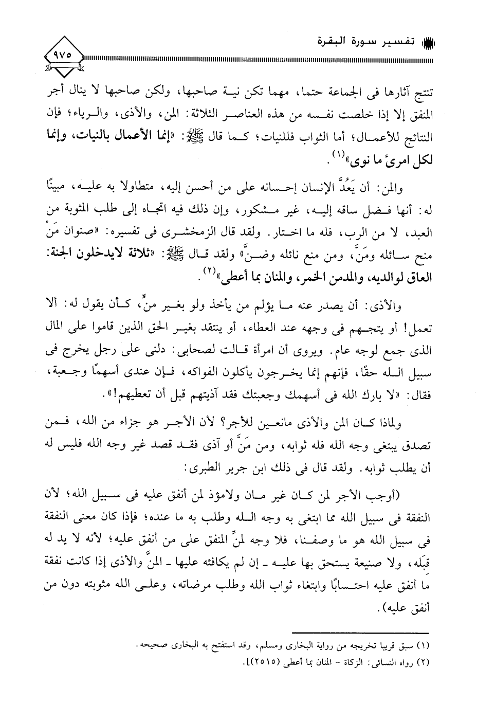 تنتج آثارها في الجماعة حتما، مهما تكن نية صاحبها، ولكن صاحبها لَا ينال أجر المنفق إلا إذا خلصت نفسه من هذه العناصر الثلاثة: المن، والأذى، والرياء؛ فإن النتائج للأعمال، أما الثواب فللنيات؛ كما قال - صلى الله عليه وسلم -: " إنما الأعمال بالنيات، وإنما لكل امرئ ما نوى " (¬1).