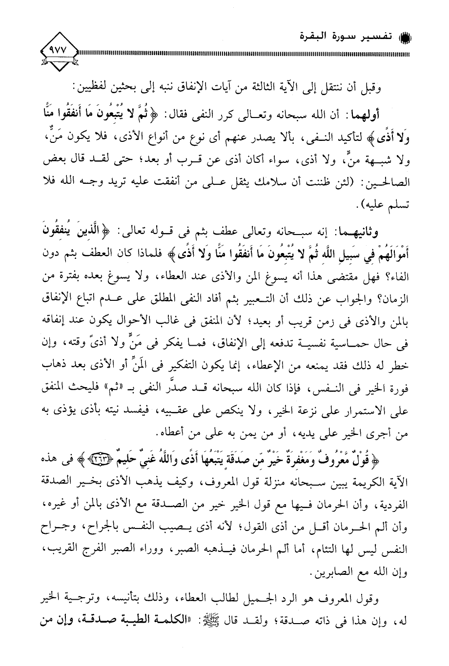 وقبل أن ننتقل إلى الآية الثالثة من آيات الإنفاق ننبه إلى بحثين لفظيين: أولهما: أن الله سبحانه وتعالى كرر النفي فقال: (ثُمَّ لَا يُتْبِعُونَ مَا أَنفَقُوا مَنًّا وَلا أَذًى) لتأكيد النفي، بألا يصدر عنهم أي نوع من أنواع الأذى، فلا يكون مَنّ، ولا شبهة منٍّ، ولا أذى، سواء أكان أذى عن قرب أو بعد؛ حتى لقد قال بعض الصالحين: (لئن ظننت أن سلامك يثقل على من أنفقت عليه تريد وجه الله فلا تسلم عليه).