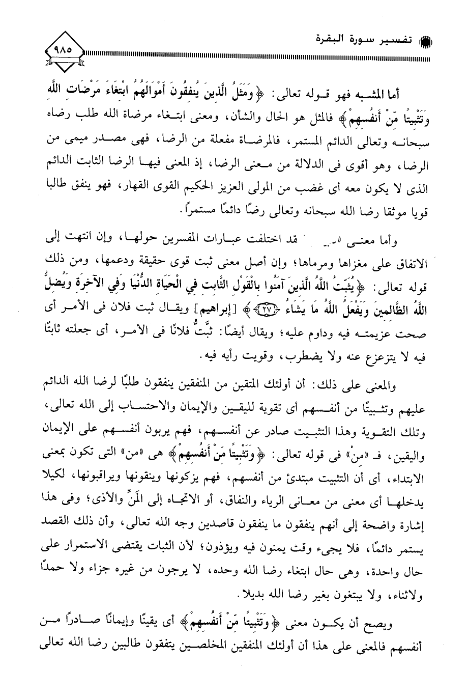 والمعنى على ذلك: أن أولئك المتقين من المنفقين ينفقون طلبًا لرضا الله الدائم عليهم وتثبيتًا من أنفسهم أي تقوية لليقين والإيمان والاحتساب إلى الله تعالى، وتلك التقوية وهذا التثبيت صادر عن أنفسهم، فهم يربون أنفسهم على الإيمان واليقين، فـ " مِنْ " في قوله تعالى: (وَتَثْبِيتًا مِّنْ أَنفُسِهِمْ) هي " من " التي تكون بمعنى الابتداء، أي أن التثبيت مبتدئ من أنفسهم، فهم يزكونها وينقونها ويراقبونها، لكيلا يدخلها أي معنى من معاني الرياء والنفاق، أو الاتجاه إلى المَنِّ والأذى؛ وفي هذا إشارة واضحة إلى أنهم ينفقون ما ينفقون قاصدين وجه الله تعالى، وأن ذلك القصد يستمر دائمًا، فلا يجيء وقت يمنون فيه ويؤذون؛ لأن الثبات يقتضي الاستمرار على حال واحدة، وهي حال ابتغاء رضا الله وحده، لَا يرجون من غيره جزاء ولا حمدًا ولا ثناء، ولا يبتغون بغير رضا الله بديلا.