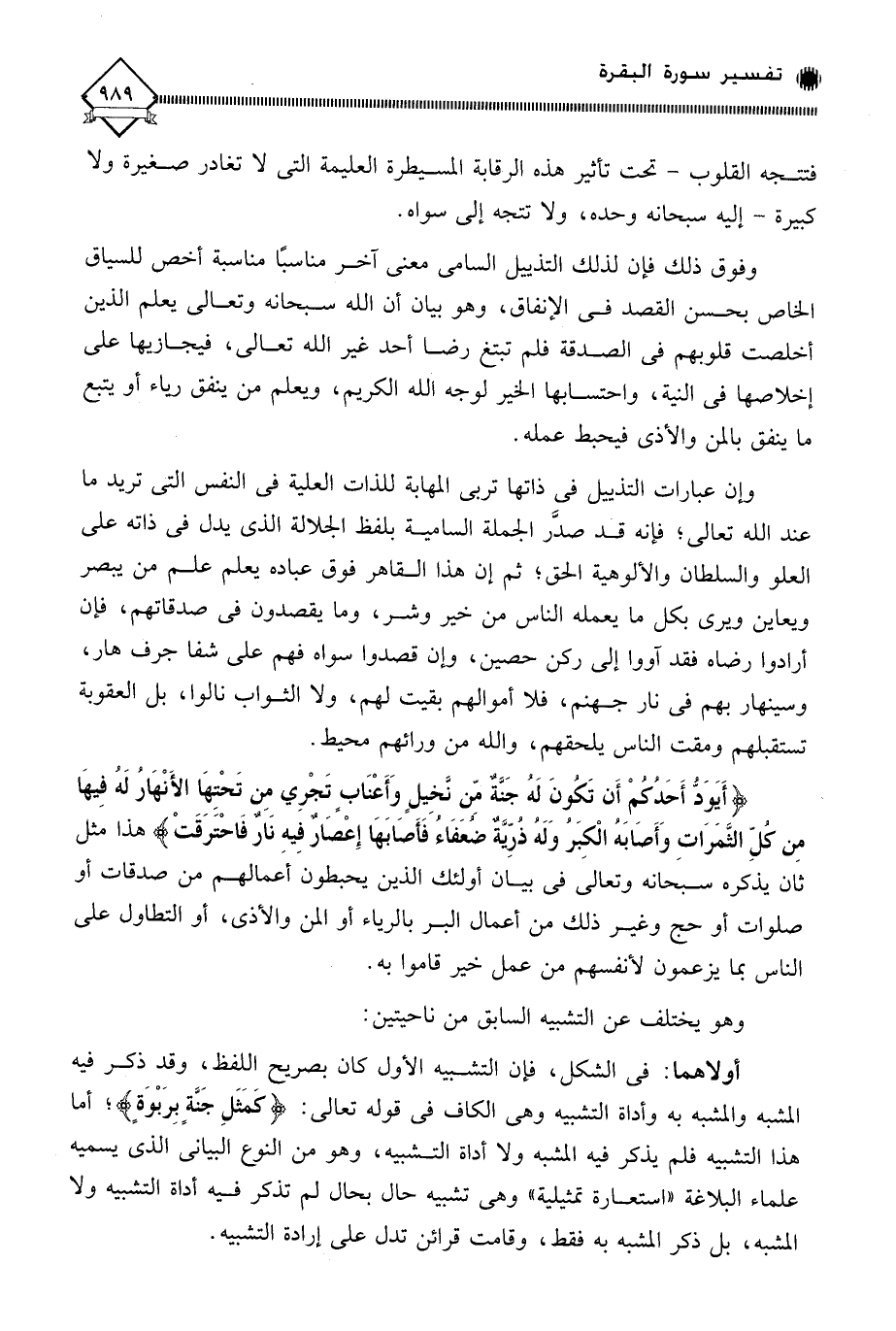 (أَيَوَدُّ أَحَدُكُمْ أَنْ تَكُونَ لَهُ جَنَّةٌ مِنْ نَخِيلٍ وَأَعْنَابٍ تَجْرِي مِنْ تَحْتِهَا الْأَنْهَارُ لَهُ فِيهَا مِنْ كُلِّ الثَّمَرَاتِ وَأَصَابَهُ الْكِبَرُ وَلَهُ ذُرِّيَّةٌ ضُعَفَاءُ فَأَصَابَهَا إِعْصَارٌ فِيهِ نَارٌ فَاحْتَرَقَتْ (266)