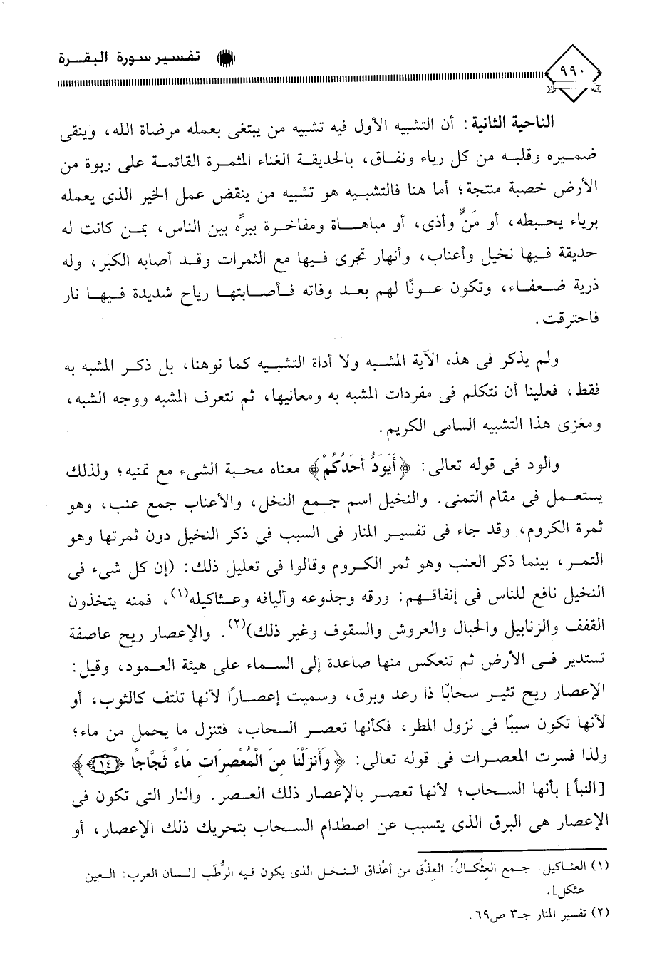 الناحية الثانية: أن التشبيه الأول فيه تشبيه من يبتغي بعمله مرضاة الله، وينقي ضميره وقلبه من كل رياء ونفاق، بالحديقة الغناء المثمرة القائمة على ربوة من الأرض خصبة منتجة؛ أما هنا فالتشبيه هو تشبيه من ينقض عمل الخير الذي يعمله برياء يحبطه، أو مَنٍّ وأذى، أو مباهاة ومفاخرة ببرِّه بين الناس، بمن كانت له حديقة فيها نخيل وأعناب، وأنهار تجري فيها مع الثمرات وقد أصابه الكبر، وله ذرية ضعفاء، وتكون عونًا لهم بعد وفاته فأصابتها رياح شديدة فيها نار فاحترقت.