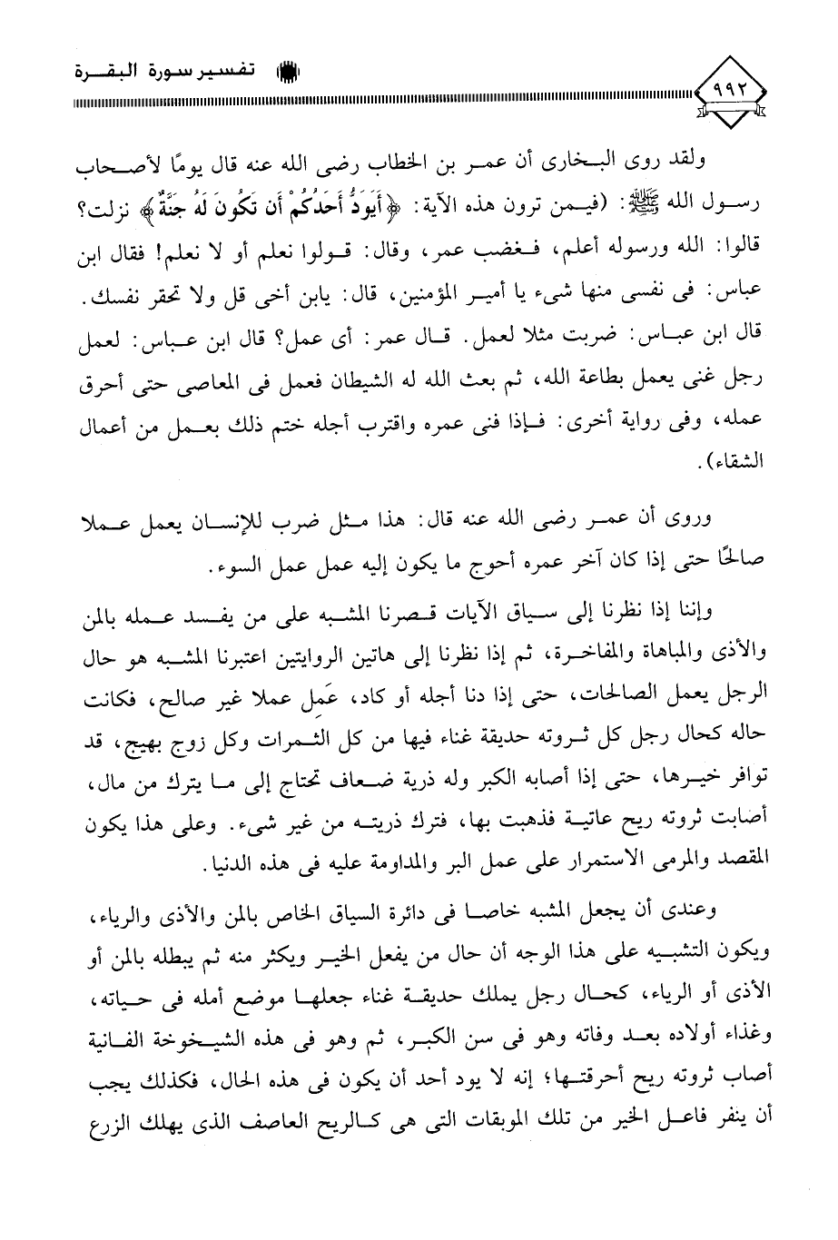 وإننا إذا نظرنا إلى سياق الآيات قصرنا المشبه على من يفسد عمله بالمن والأذى والمباهاة والمفاخرة، ثم إذا نظرنا إلى هاتين الروايتين اعتبرنا المشبه هو حال الرجل يعمل الصالحات، حتى إذا دنا أجله أو كاد، عَمِل عملا غير صالح، فكانت حاله كحال رجل كل ثروته حديقة غناء فيها من كل الثمرات وكل زوج بهيج، قد توافر خيرها، حتى إذا أصابه الكبر وله ذرية ضعاف تحتاج إلى ما يترك من مال، أصابت ثروته ريح عاتية فذهبت بها، فترك ذريته من غير شيء. وعلى هذا يكون المقصد والمرمى الاستمرار على عمل البر والمداومة عليه في هذه الدنيا.