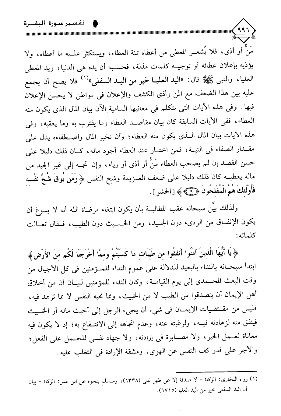 مَنٌّ أو أذى، فلا يُشعر المعطي من أعطاه بمنة العطاء، ويستكثر عليه ما أعطاه، ولا يؤذيه بإعلان عطائه أو توجيه كلمات مذلة، فحسبه أن يده هي الدنيا، ويد المعطي العليا، والنبي - صلى الله عليه وسلم - قال: " اليد العليا خير من اليد السفلى " (¬1) فلا يصح أن يجمع عليه بين هذا الضعف مع المن وأذى الكشف والإعلان في مواطن لَا يحسن الإعلان فيها. وفي هذه الآيات التي نتكلم في معانيها السامية الآن بيان المال الذي يكون منه العطاء، ففي الآيات السابقة كان بيان مقاصد العطاء وما يقترب به وما يعقبه، وفي هذه الآيات بيان المال الذي يكون منه العطاء؛ وأن تخير المال واصطفاءه يدل على مقدار الصفاء في النية، فمن اختار عند العطاء أجود ماله، كان ذلك دليلا على حسن القصد إن لم يصحب العطاء مَنٌّ أو أذى أو رياء، وإن اتجه إلى غير الجيد من ماله يعطيه كان ذلك دليلا على ضعف العزيمة وشح النفس (وَمَن يُوقَ شُحَّ نَفْسِه فَأُوْلَئِكَ هُمُ الْمُفْلِحُونَ).