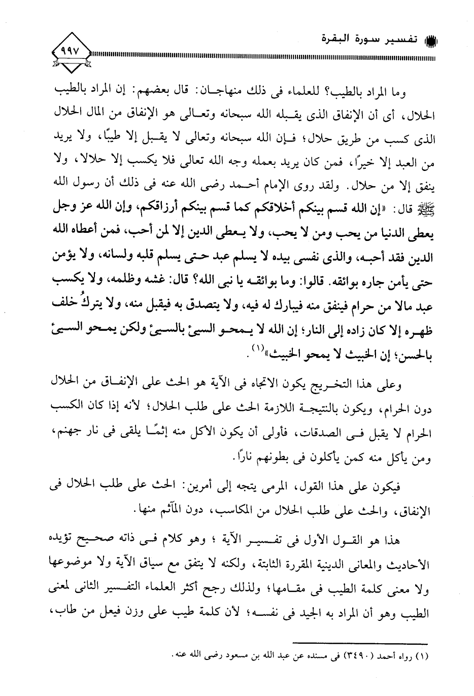 وما المراد بالطيب؛ للعلماء في ذلك منهاجان: قال بعضهم: إن المراد بالطيب الحلال، أي أن الإنفاق الذي يقبله الله سبحانه وتعالى هو الإنفاق من المال الحلال الذي كسب من طريق حلال؛ فإن الله سبحانه وتعالى لَا يقبل إلا طيبًا، ولا يريد من العبد إلا خيرا، فمن كان يريد بعمله وجه الله تعالى فلا يكسب إلا حلالا، ولا ينفق إلا من حلال. ولقد روى الإمام أحمد رضي الله عنه في ذلك أن رسول الله - صلى الله عليه وسلم - قال: " إِنَّ اللهَ قَسَمَ بَيْنَكُمْ أَخْلَاقَكُمْ، كَمَا قَسَمَ بَيْنَكُمْ أَرْزَاقَكُمْ، وَإِنَّ اللهَ عَزَّ وَجَلَّ يُعْطِي الدُّنْيَا مَنْ يُحِبُّ وَمَنْ لَا يُحِبُّ، وَلَا يُعْطِي الدِّينَ إِلَّا لِمَنْ أَحَبَّ، فَمَنْ أَعْطَاهُ اللهُ الدِّينَ، فَقَدْ أَحَبَّهُ، وَالَّذِي نَفْسِي بِيَدِهِ، لَا يُسْلِمُ عَبْدٌ حَتَّى يَسْلَمَ قَلْبُهُ وَلِسَانُهُ، وَلَا يُؤْمِنُ حَتَّى يَأْمَنَ جَارُهُ بَوَائِقَهُ "، قَالُوا: وَمَا بَوَائِقُهُ يَا نَبِيَّ اللهِ؟ قَالَ: " غَشْمُهُ وَظُلْمُهُ، وَلَا يَكْسِبُ عَبْدٌ مَالًا مِنْ حَرَامٍ، فَيُنْفِقَ مِنْهُ فَيُبَارَكَ لَهُ فِيهِ، وَلَا يَتَصَدَّقُ بِهِ فَيُقْبَلَ مِنْهُ، وَلَا يَتْرُكُ خَلْفَ ظَهْرِهِ إِلَّا كَانَ زَادَهُ إِلَى النَّارِ، إِنَّ اللهَ عَزَّ وَجَلَّ لَا يَمْحُو السَّيِّئَ بِالسَّيِّئِ، وَلَكِنْ يَمْحُو السَّيِّئَ بِالْحَسَنِ، إِنَّ الْخَبِيثَ لَا يَمْحُو الْخَبِيثَ " (¬1).