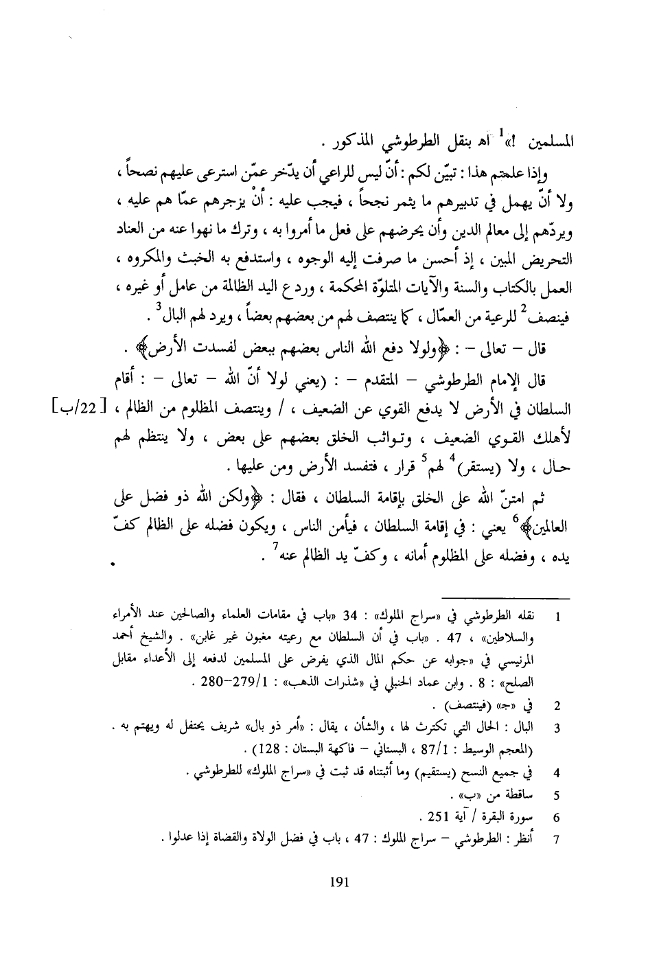 7 - أنظر: الطرطوشي- سراج الملوك: 47"باب في فضل الولاة والقضاة إذا عدلوا.