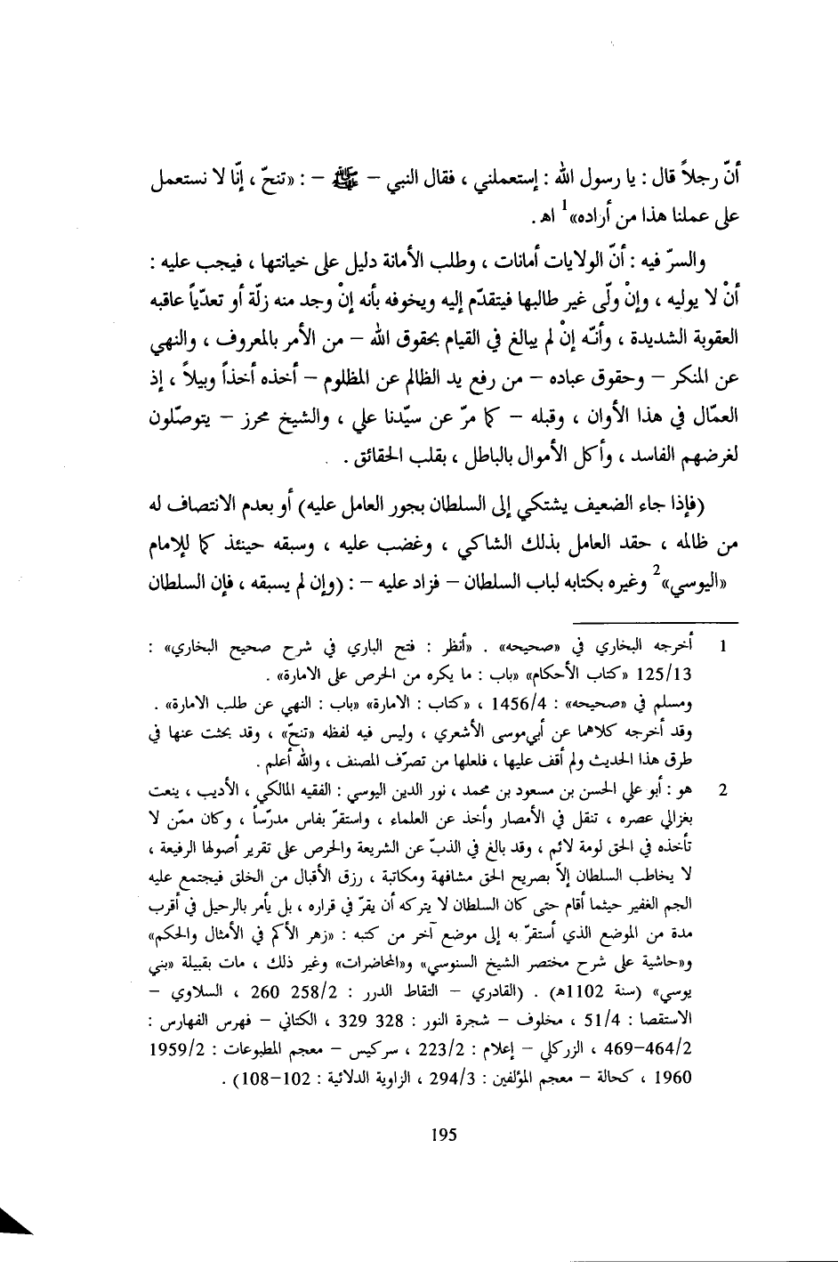 1 - أخرجه البخاري في "صحيحه". "أنظر: فتح الباري في شرح صحيح البخاري": 13/ 125 "كتاب الأحكام"، "باب: ما يكره من الحرص على الامارة".