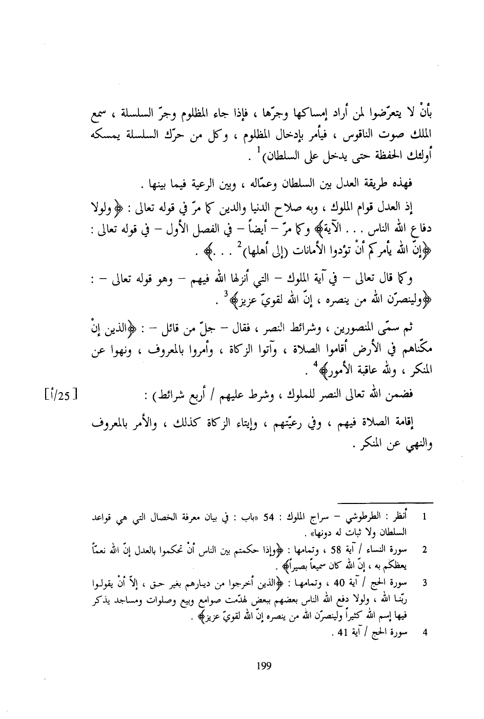 فضمن الله تعالى النصر للملوك، وشرط عليهم [25/أ] أربع شرائط):