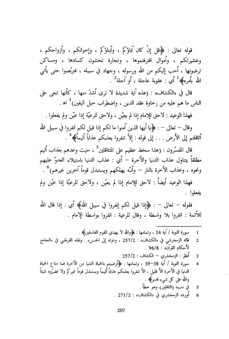 وقال- تعالى-: {يَا أَيُّةا الَّذِينَ آمَنُوا مَا لَكُمْ إِذَا قِيلَ لَكُمُ انْفِرُوا فِي سَبِيلِ اللَّهِ اثَّاقَلْتُمْ إِلَى الْأَرْضِ ... إلى قوله: إِلَّا تَنْفِرُوا يُعَذِّبْكُمْ عَذَابًا أَلِيمًا} 4.