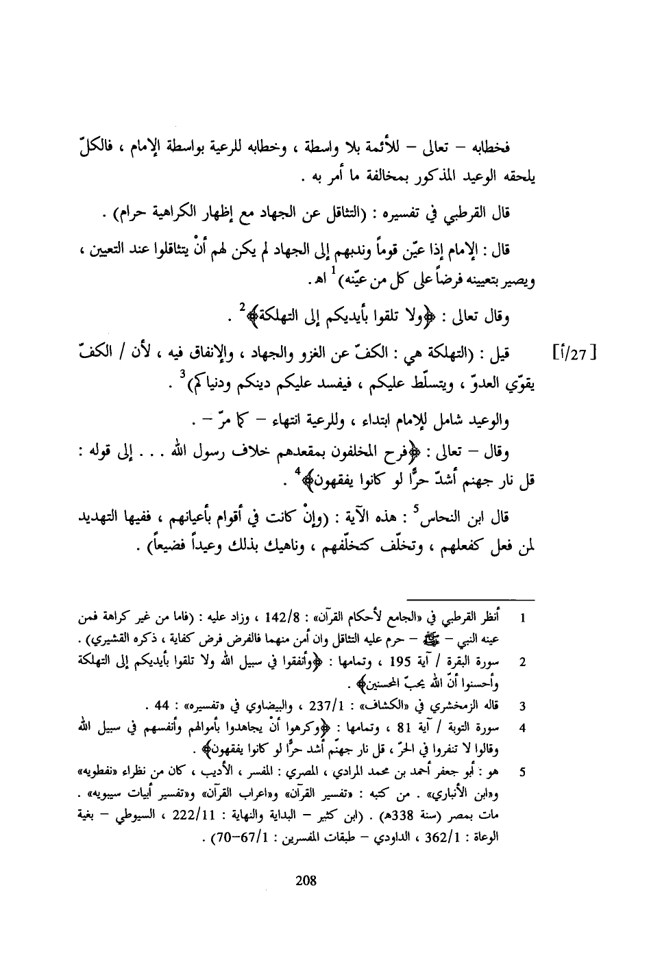 1 - أنظر القرطبي في "الجامع لأحكام القرآن": 8/ 142، وزاد عليه: (فاما من غير كراهة فمن عينه النبي - صلى الله عليه وسلم - حرم عليه التثاقل وان أمن منهما فالفرض فرض كفاية، ذكره القشيري).