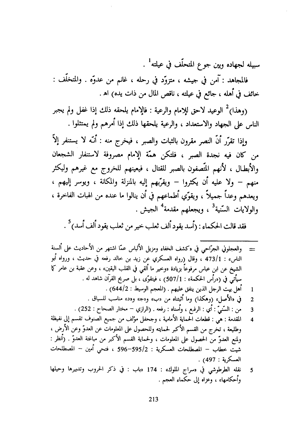 5 - نقله الطرطوشي في "سراج الملوك": 174 "باب: في ذكر الحروب وتدبيرها وحيلها وأحكامها"، وعزاه إلى حكماء العجم.
