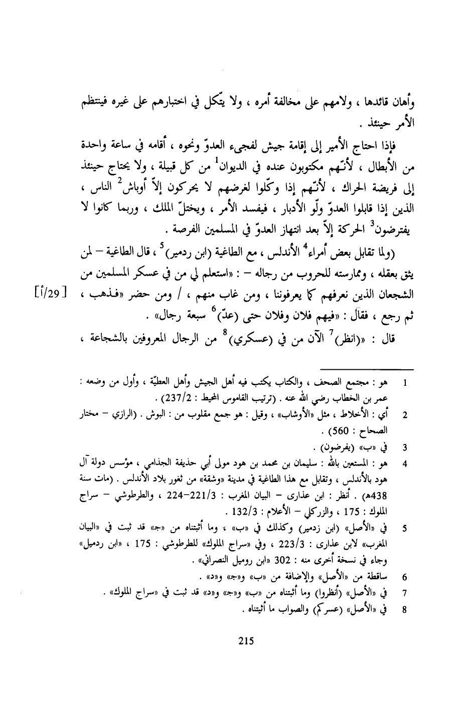 (ولما تقابل بعض أمراء 4 الأندلس، مع الطاغية (ابن ردمير) 5، قال الطاغية- لمن يثق بعقله، وممارسته للحروب من رجاله-: "استعلم لي من في عسكر المسلمين من الشجعان الذين نعرفهم كما يعرفوننا، ومن غاب منهم، [29/أ] ومن حضر "فذهب، ثم رجع، فقال: "فيهم فلان وفلان حتى (عدّ) 6 سبعة رجال".