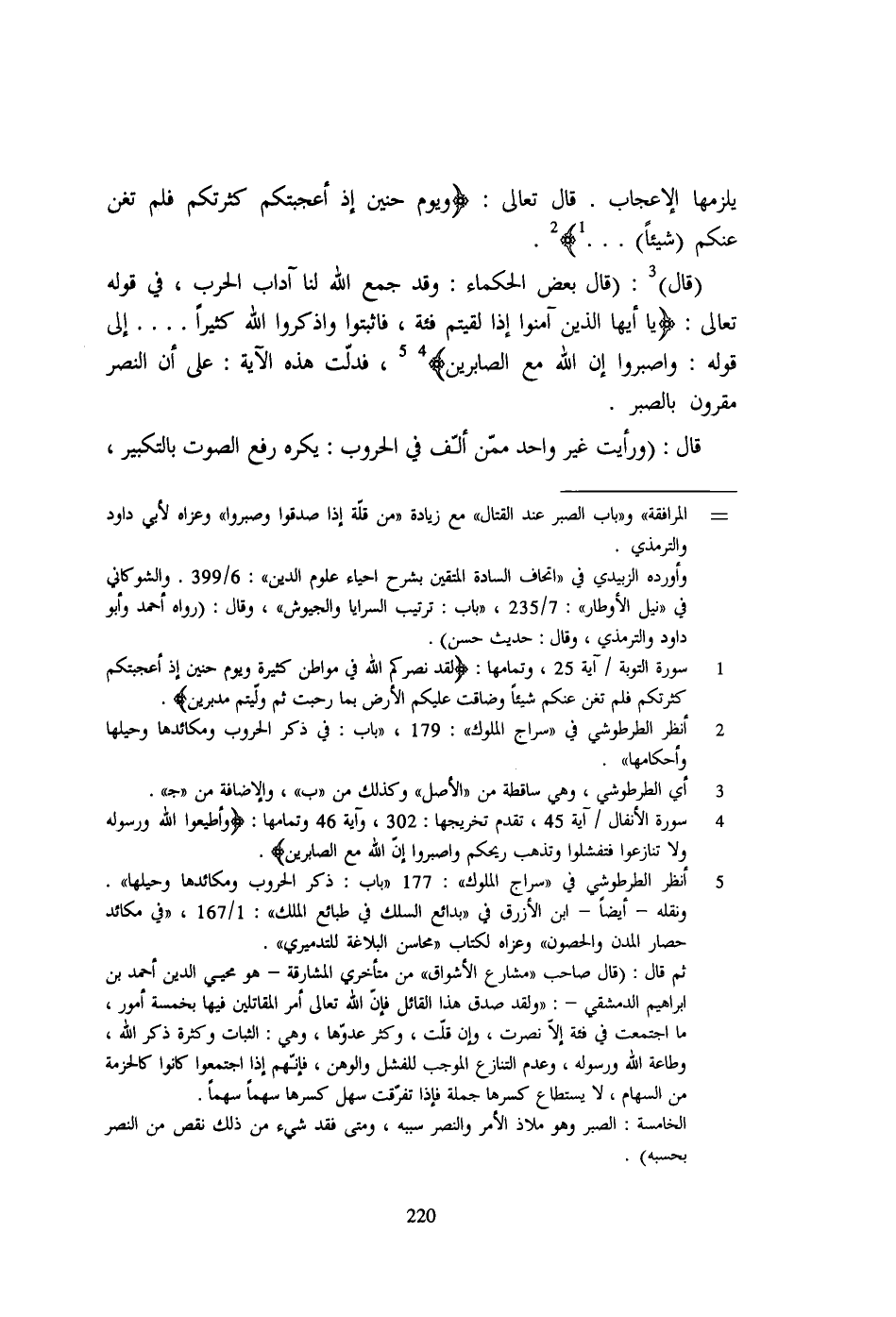 (قال) 3: (قال بعض الحكماء: وقد جمع الله لنا آداب الحرب، في قوله تعالى: {يَا أَيُّةا الَّذِينَ آمَنُوا إِذَا لَقِيتُمْ فِئَةً فَاثْبُتُوا وَاذْكُرُوا اللَّة كَثِيرًا .... إلى قوله: وَاصْبِرُوا إِنَّ اللَّة مَعَ الصَّابِرِينَ} 4 5، فدلّت هذه الآية: على أن النصر مقرون بالصبر.