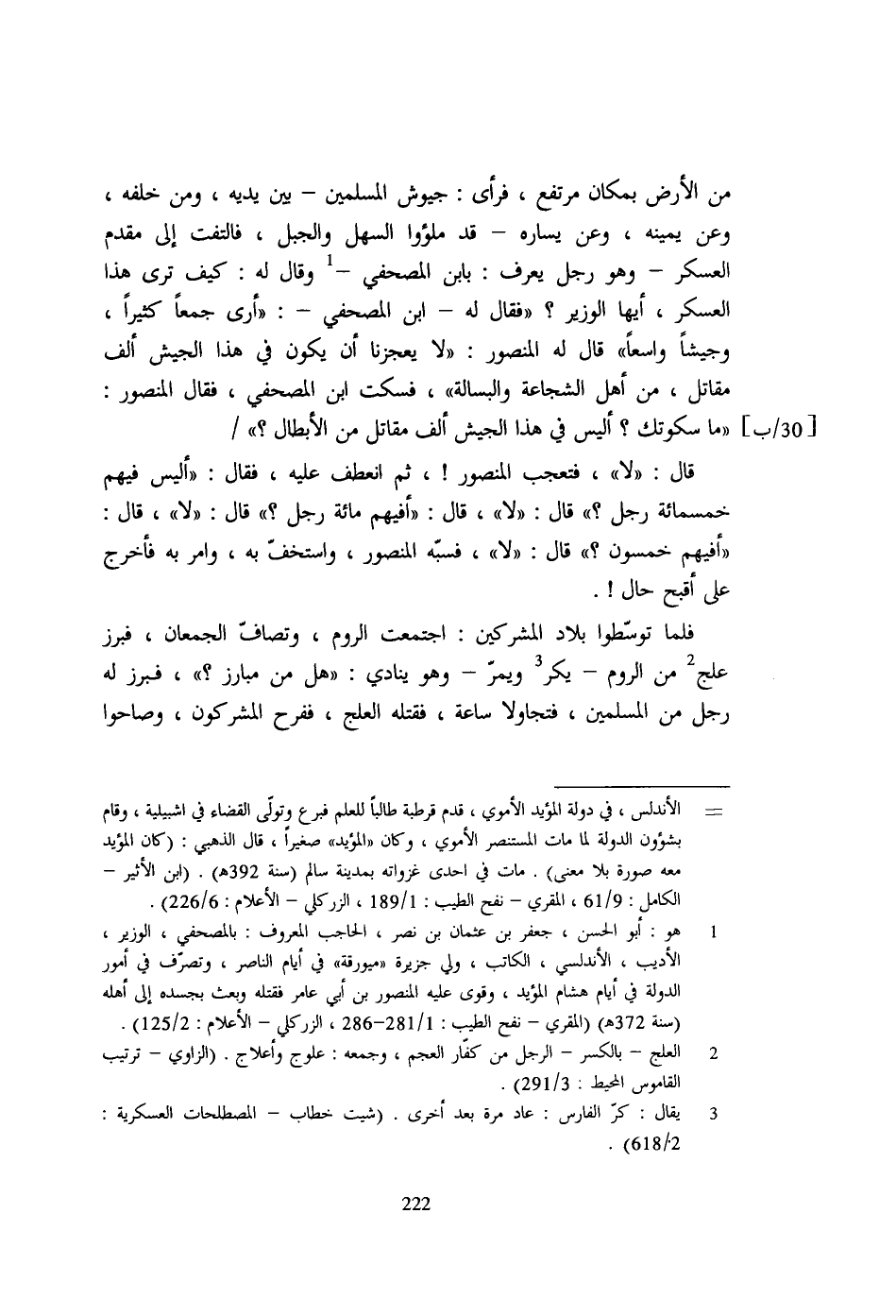 من الأرض بمكان مرتفع، فرأى: جيوش المسلمين- بين يديه، ومن خلفه، وعن يمينه، وعن يساره- قد ملؤوا السهل والجبل، فالتفت إلى مقدم العسكر- وهو رجل يعرف: بابن المصحفي- 1 وقال له: كيف ترى هذا العسكر، أيها الوزير؟ "فقال له- ابن المصحفي-: "أرى جمعاً كثيراً، وجيشاً واسعاً" قال له المنصور: "لا يعجزنا أن يكون في هذا الجيش ألف مقاتل، من أهل الشجاعة والبسالة"، فسكت ابن المصحفي، فقال المنصور: "ما سكوتك؟ أليس في هذا الجيش ألف مقاتل من الأبطال؟ " [30/ب]