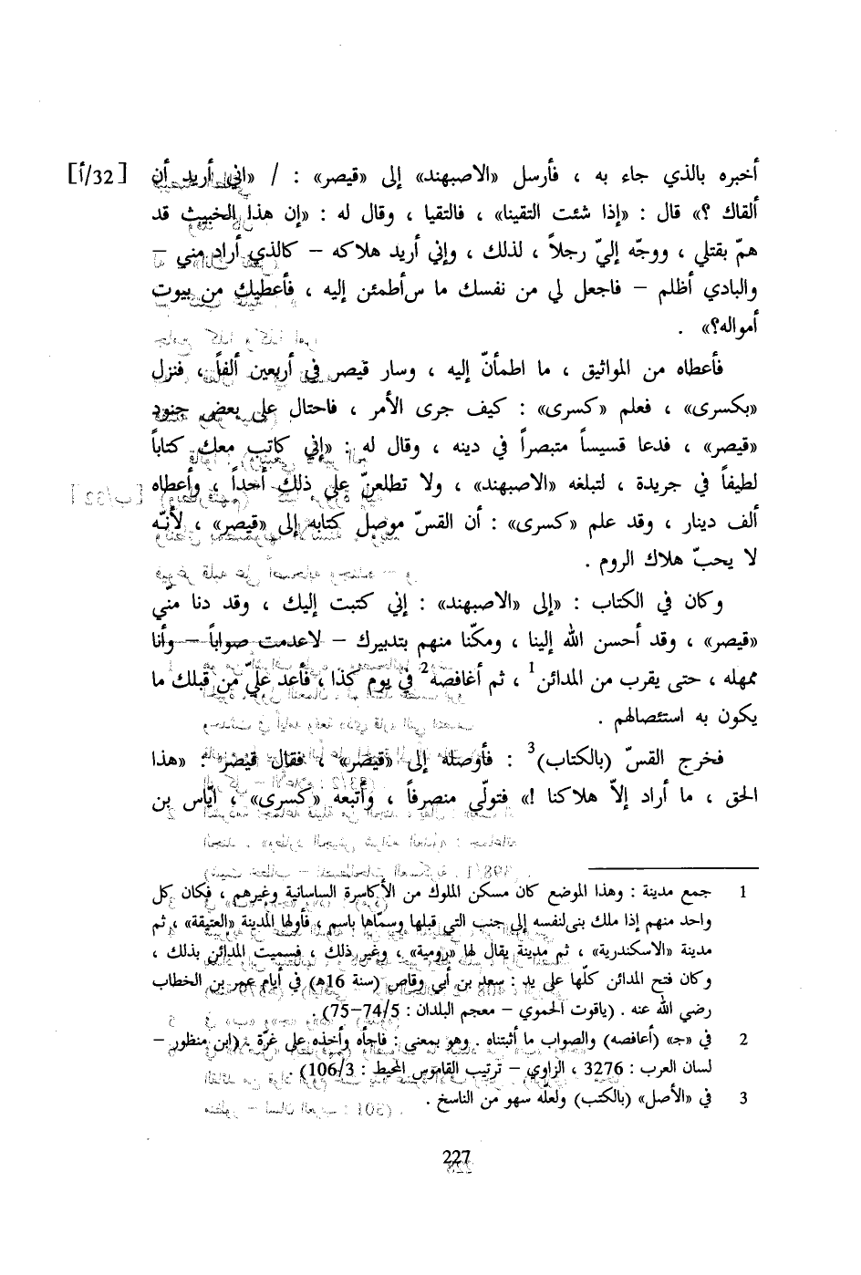 أخبره بالذي جاء به، فأرسل "الاصبهند" إلى "قيصر": [32/أ] "اني أريد أن ألقاك؟ " قال: "إذا شئت التقينا"، فالتقيا، وقال له: "إن هذا الخبيث قد همّ بقتلي، ووجّه إليّ رجلاً، لذلك، وإني أريد هلاكه- كالذي أراد مني- والبادي أظلم- فاجعل لي من نفسك ما سأطمئن إليه، فأعطيك من بيوت أمواله؟ ".