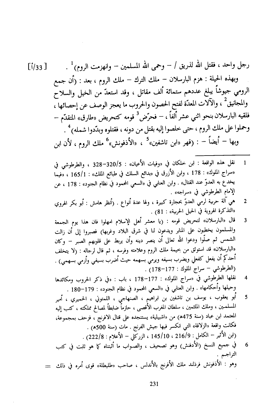رجل واحد، فقتل الله لذريق [33/أ]- وحمى الله المسلمين- وانهزمت الروم) 1.