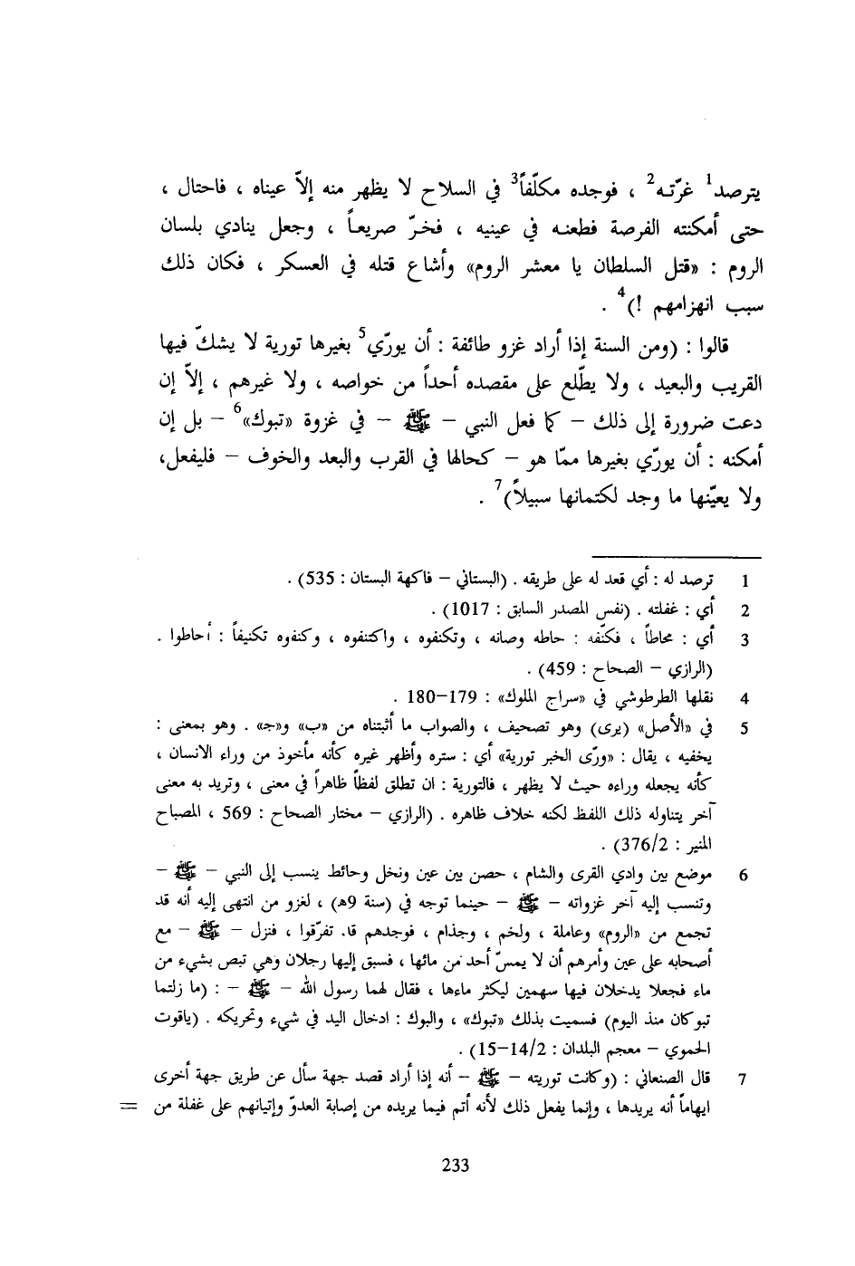 7 - قال الصنعاني: (وكانت توريته - صلى الله عليه وسلم - أنه إذا أراد قصد جهة سأل عن طريق جهة أخرى ايهاماً أنه يريدها، وإنما يفعل ذلك لأنه أتم فيما يريده من إصابة العدوّ وإتيانهم على غفلة من =