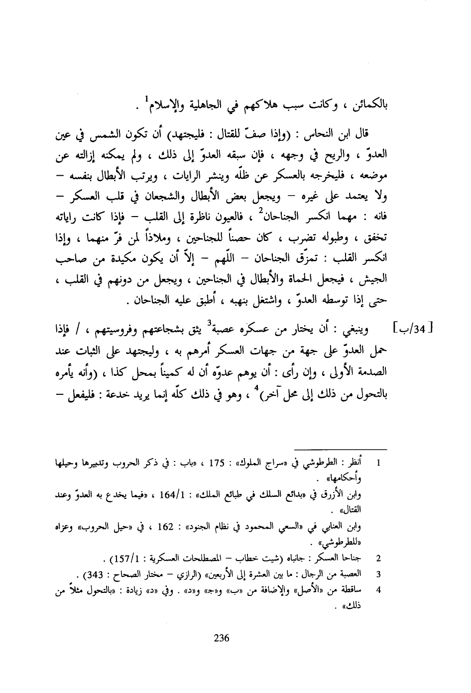 1 - أنظر: الطرطوشي في "سراج الملوك": 175، "باب: في ذكر الحروب وتدبيرها وحيلها وأحكامها".