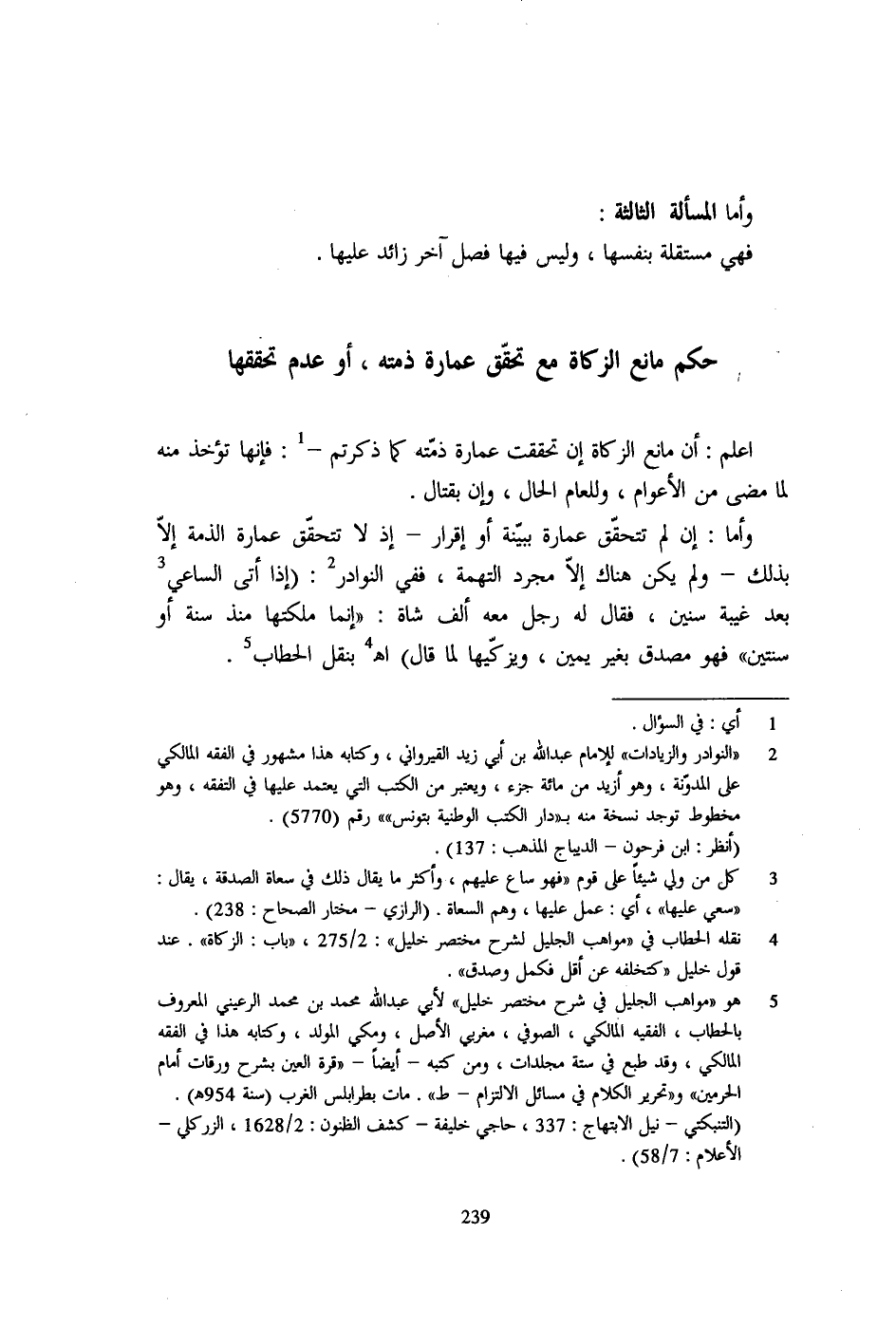 5 - هو "مواهب الجليل في شرح مختصر خليل" لأبي عبد الله محمد بن محمد الرعيني المعروف بالحطاب، الفقيه المالكي، الصوفي، مغربي الأصل، ومكي المولد، وكتابه هذا في الفقه المالكي، وقد طبع في ستة مجلدات، ومن كتبه- أيضاً- "قرة العين بشرح ورقات إمام الحرمين" و"تحرير الكلام في مسائل الالتزام- ط". مات بطرابلس الغرب (سنة 954هـ). (التنبكتي- نيل الابتهاج: 337، حاجي خليفة- كشف الظون: 2/ 1628، الزركلي- الأعلام: 7/ 58).