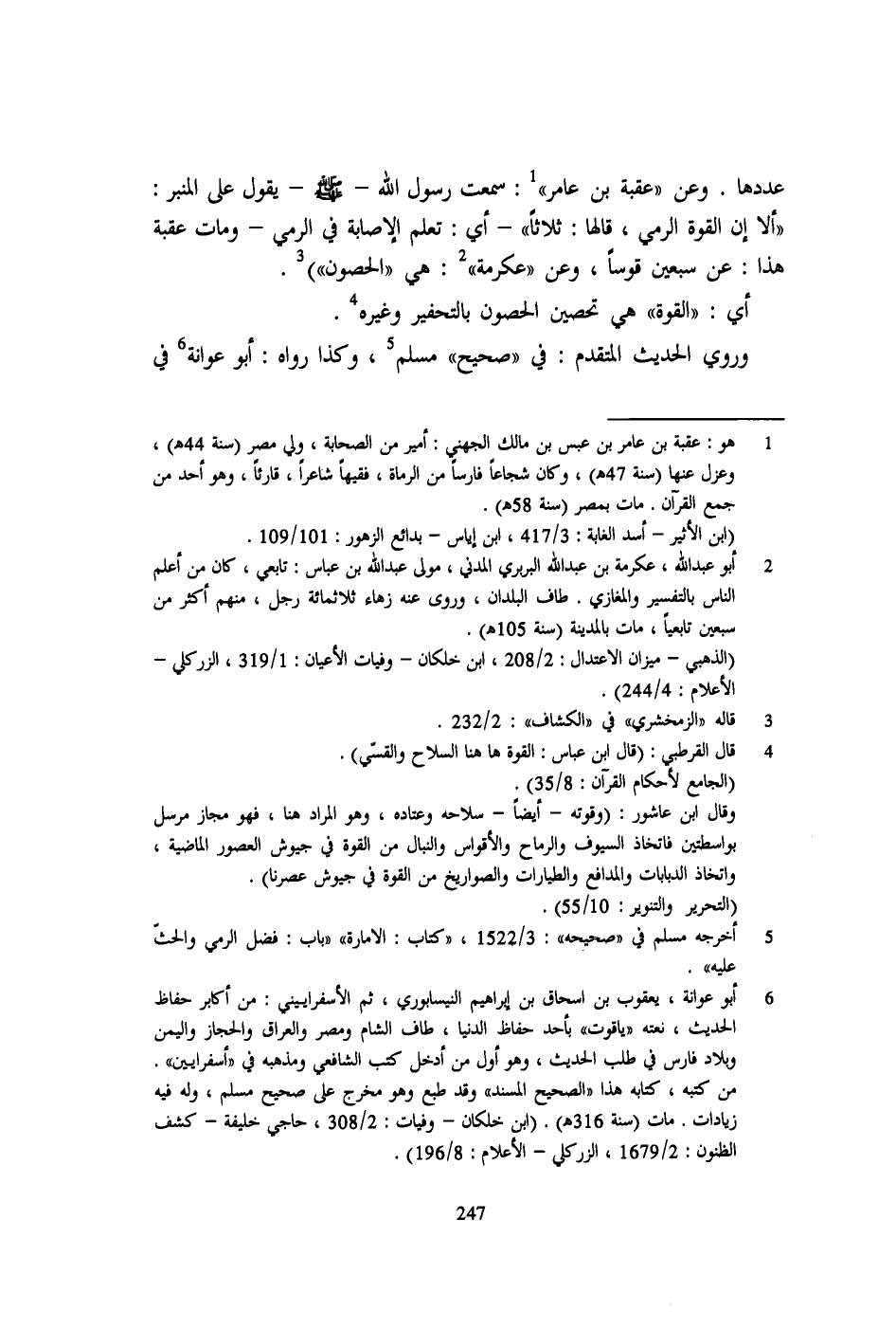 "ألا إن القوة الرمي، قالها: ثلاثاً"- أي: تعلم الإصابة في الرمي- ومات عقبة هذا: عن سبعين قوساً، وعن "عكرمة" 2: هي "الحصون") 3.