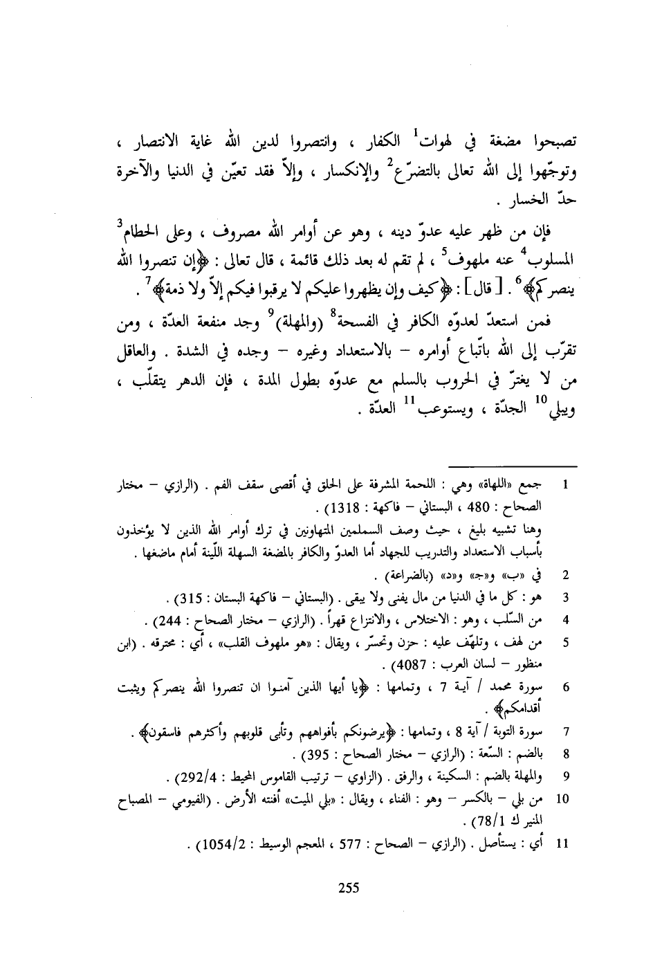 فإن من ظهر عليه عدوّ دينه، وهو عن أوامر الله مصروف، وعلى الحطام 3 المسلوب 4 عنه ملهوف 5، لم تقم له بعد ذلك قائمة، قال تعالى: {إِنْ تَنْصُرُوا اللَّة يَنْصُرْكُمْ} 6. [قال]: {كَيْفَ وَإِنْ يَظْةرُوا عَلَيْكُمْ لَا يَرْقُبُوا فِيكُمْ إِلًّا وَلَا ذِمَّةً} 7.