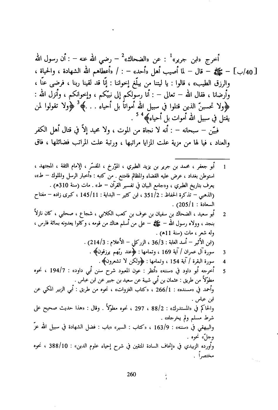 أخرج "ابن جرير" 1: عن "الضحاك" 2 - رضي الله عنه-: أن رسول الله - صلى الله عليه وسلم - قال- لما أصيب أهل "أحد"-: [40/ب] "أعطاهم الله الشهادة، والحياة، والرزق الطيب"، قالوا: يا ليتنا من يبلّغ إخواننا: إنّا قد لقينا ربنا، فرضي عنّا، وأرضانا، فقال الله- تعالى-: أنا رسولكم إلى نبيّكم، وإخوانكم، وأنزل الله: {وَلَا تَحْسَبَنَّ الَّذِينَ قُتِلُوا فِي سَبِيلِ اللَّهِ أَمْوَاتًا بَلْ أَحْيَاءٌ ... } 3 {وَلَا تَقُولُوا لِمَنْ يُقْتَلُ فِي سَبِيلِ اللَّهِ أَمْوَاتٌ بَلْ أَحْيَاءٌ} 4 5.