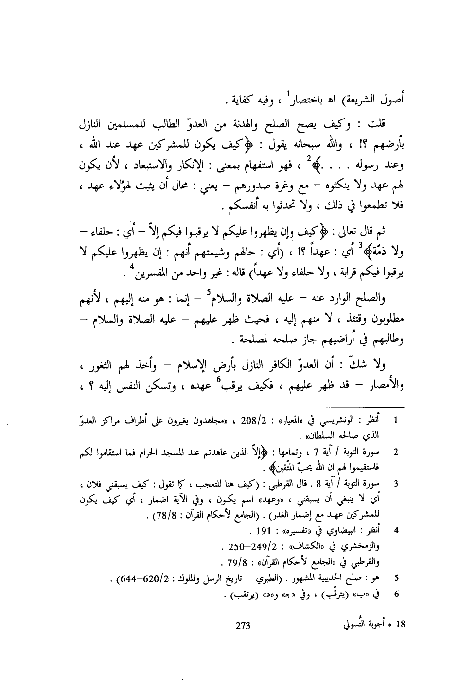 قلت: وكيف يصح الصلح والهدنة من العدوّ الطالب للمسلمين النازل بأرضهم؟!، والله سبحانه يقول: {كَيْفَ يَكُونُ لِلْمُشْرِكِينَ عَةدٌ عِنْدَ اللَّهِ وَعِنْدَ رَسُولِهِ .... } 2، فهو استفهام بمعنى: الإنكار والاستبعاد، لأن يكون لهم عهد ولا ينكثوه- مع وغرة صدورهم- يعنى: محال أن يثبت لهؤلاء عهد، فلا تطمعوا في ذلك، ولا تحدثوا به أنفسكم.