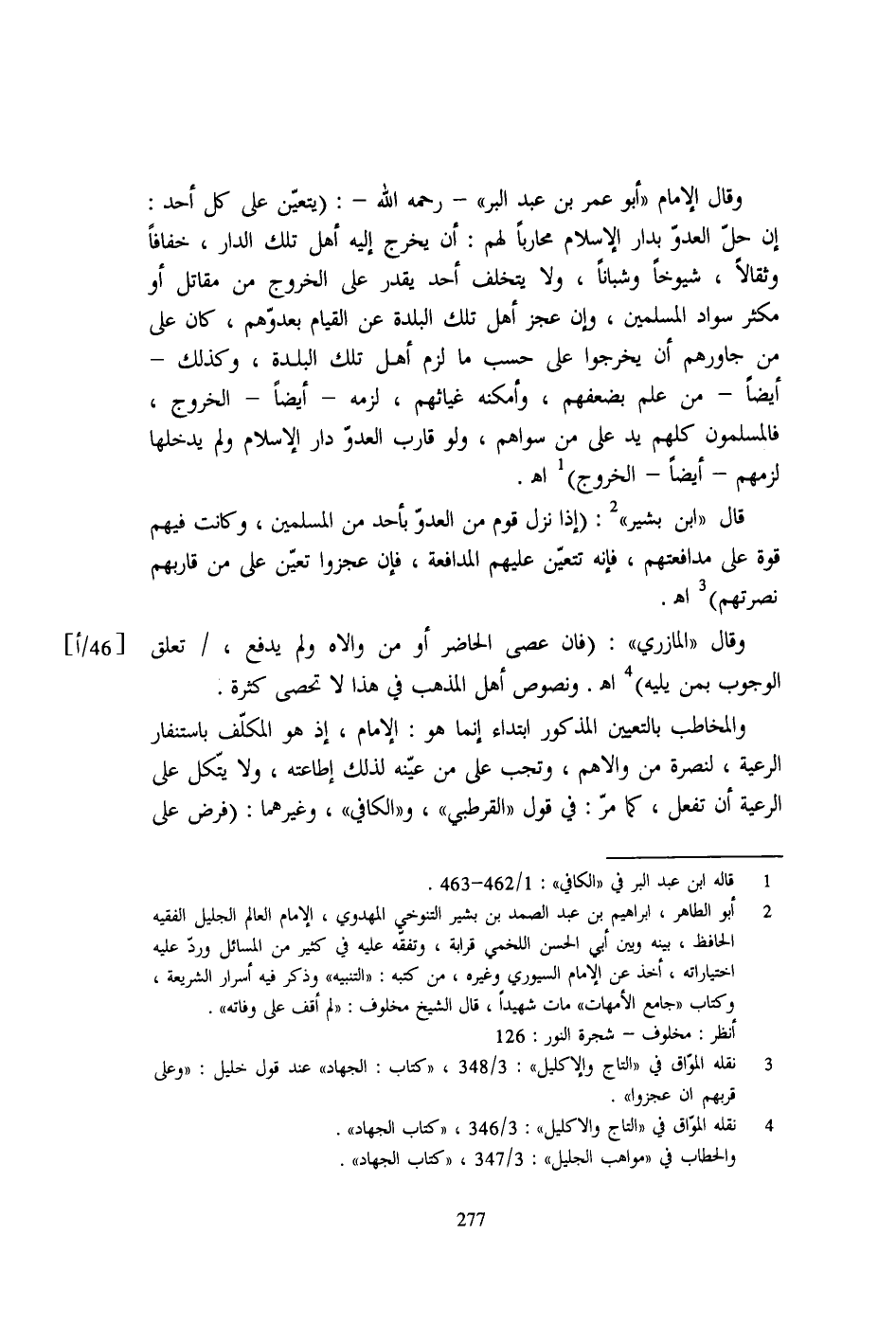 3 - نقله الموّاق في "التاج والإكليل": 3/ 348، "كتاب: الجهاد" عند قول خليل: "وعلى قربهم ان عجزوا".
