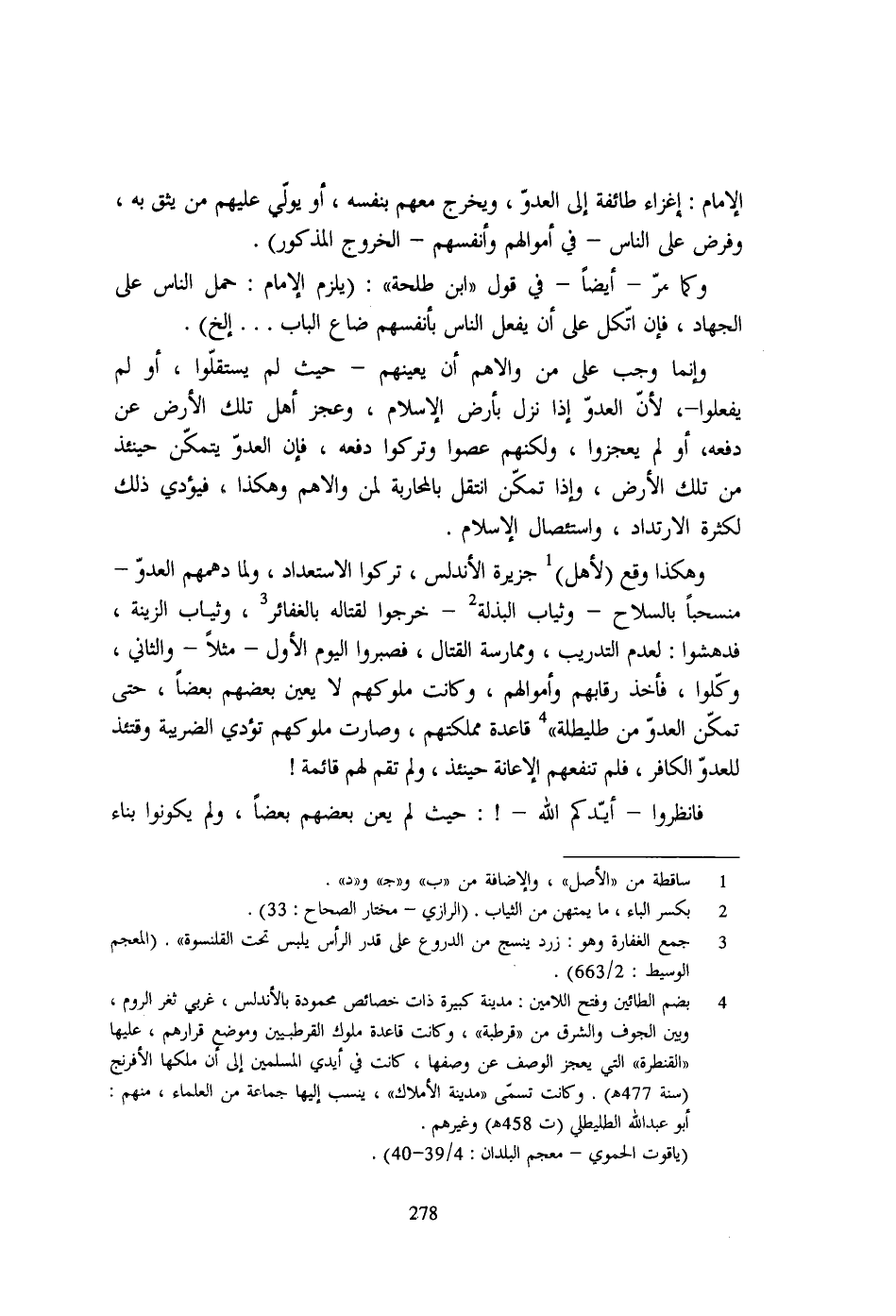 وكما مرّ- أيضاً- في قول "ابن طلحة": (يلزم الإمام: حمل الناس على الجهاد، فإن اتّكل على أن يفعل الناس بأنفسهم ضاع الباب ... إلخ).