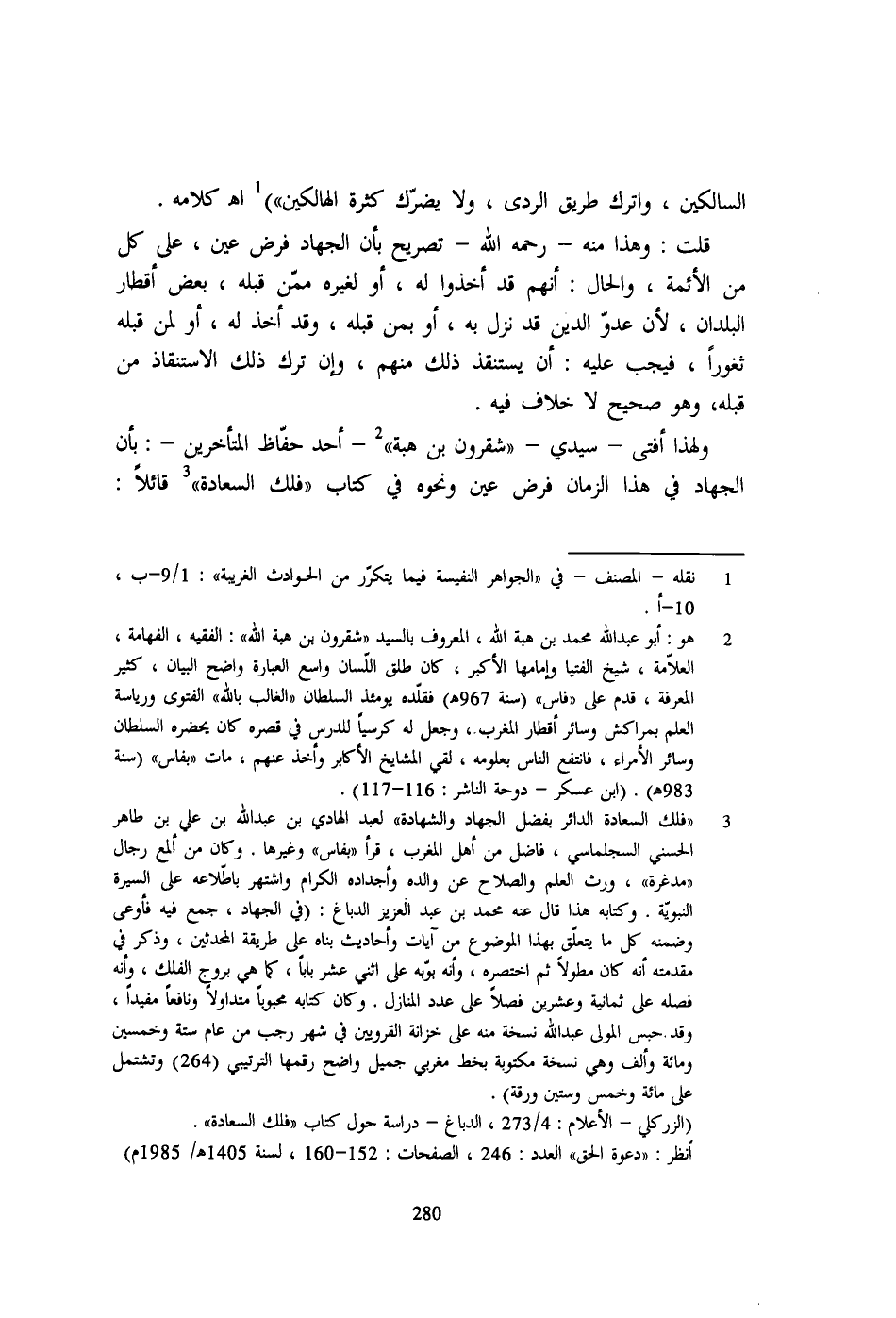 ولهذا أفتى- سيدي- "شقرون بن هبة" 2 - أحد حفّاظ المتأخرين-: بأن الجهاد في هذا الزمان فرض عين ونحوه في كتاب "فلك السعادة" 3 قائلاً: