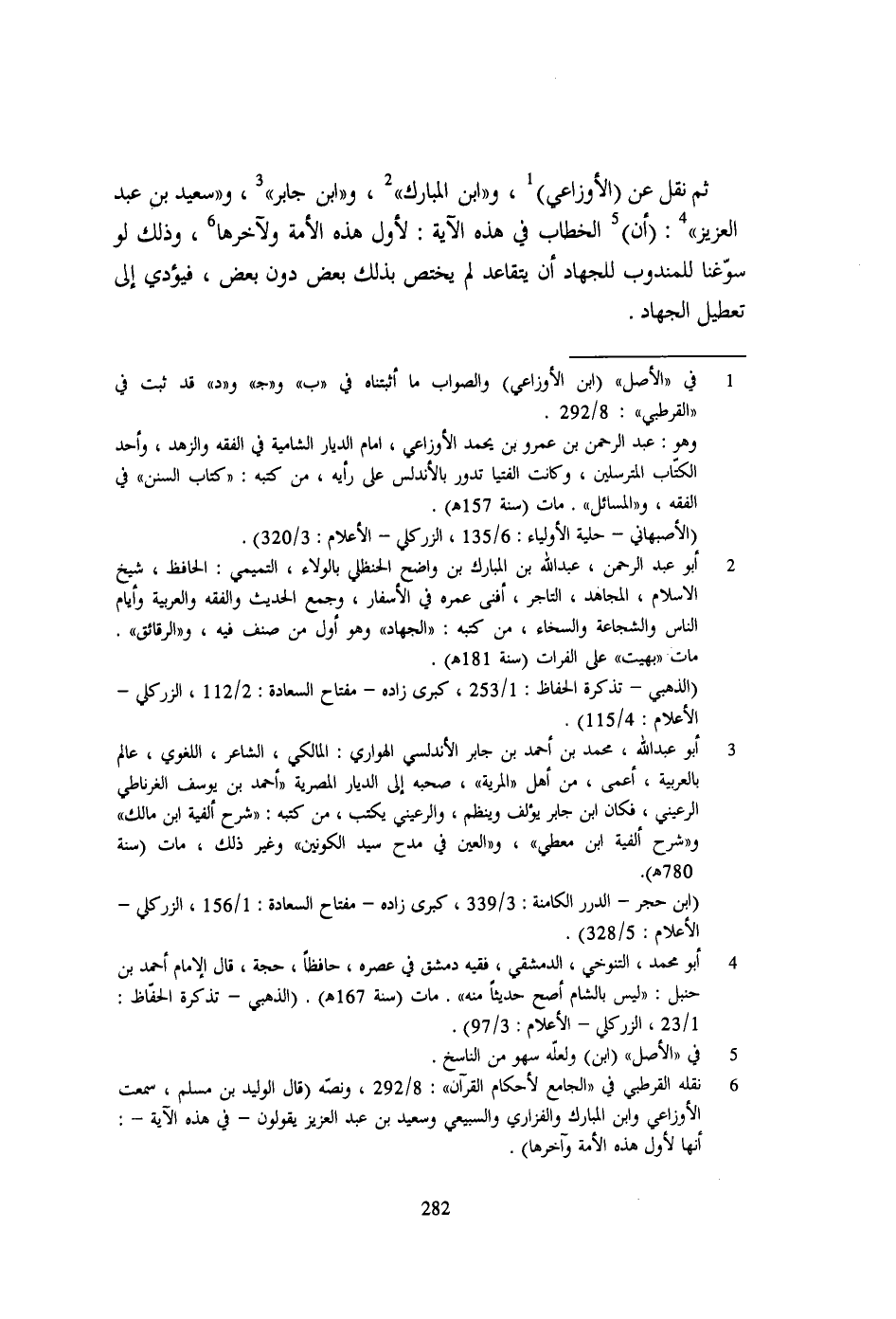 6 - نقله القرطبي في "الجامع لأحكام القرآن": 8/ 292، ونصّه (قال الوليد بن مسلم، سمعت الأوزاعي وابن المبارك والفزاري والسبيعي وسعيد بن عبد العزيز يقولون- في هذه الآية-: أنها لأول هذه الأمة وآخرها).
