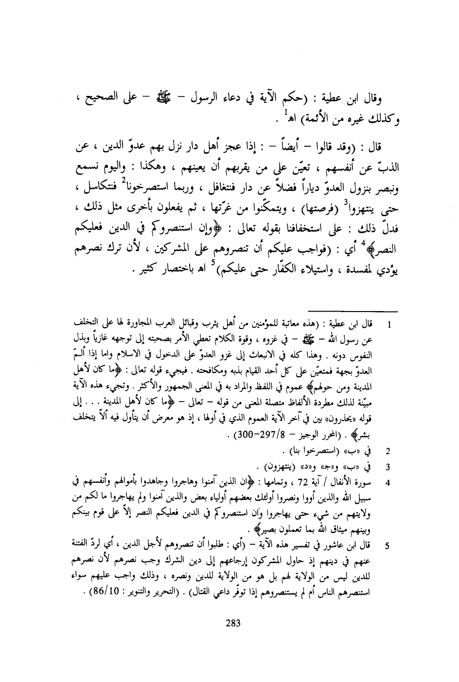 قال: (وقد قالوا- أيضاً-: إذا عجز أهل دار نزل بهم عدوّ الدين، عن الذبّ عق أنفسهم، تعيّن على من يقربهم أن يعينهم، وهكذا: واليوم نسمع ونبصر بنزول العدوّ دياراً فضلاً عن دار فنتغافل، وربما استصرخونا 2 فنتكاسل، حتى ينتهزوا 3 (فرصتها)، ويتمكّنوا من غرّتها، ثم يفعلون بأخرى مثل ذلك، فدلّ ذلك: على استخفافنا بقوله تعالى: {وَإِنِ اسْتَنْصَرُوكُمْ فِي الدِّينِ فَعَلَيْكُمُ النَّصْرُ} 4 أي: (فواجب عليكم أن تنصروهم على المشركين، لأن ترك نصرهم يؤدي لمفسدة، واستيلاء الكفّار حتى عليكم) 5 اهـ باختصار كثير.
