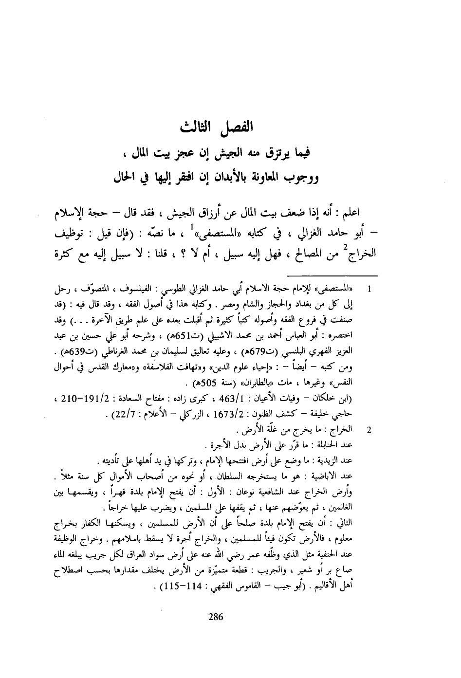 اعلم: أنه إذا ضعف بيت المال عن أرزاق الجيش، فقد قال- حجة الإسلام - أبو حامد الغزالي، في كتابه "المستصفى" 1، ما نصّه: (فإن قيل: توظيف الخراج 2 من المصالح، فهل إليه سبيل، أم لا؟، قلنا: لا سبيل إليه مع كثرة