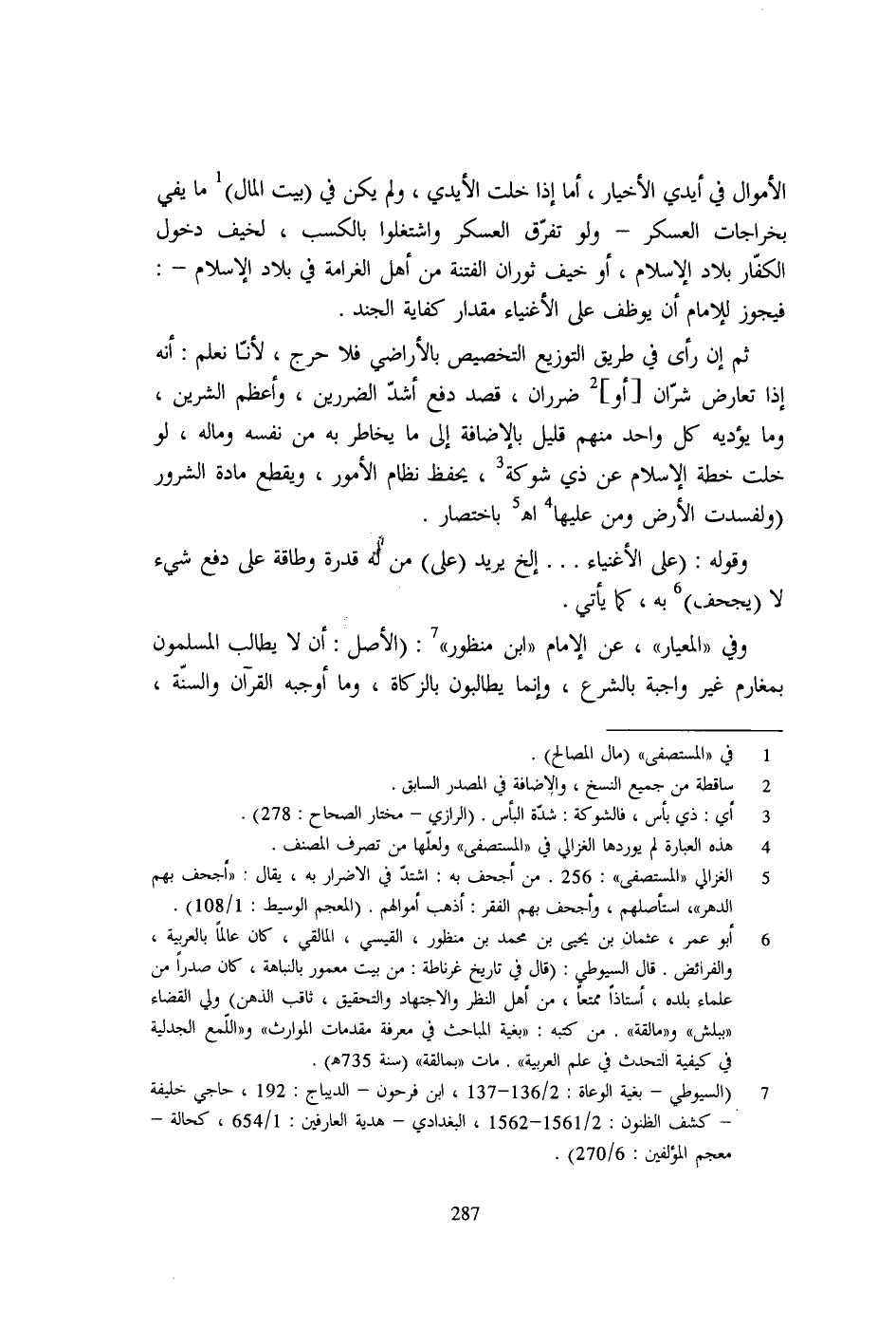 وفي "المعيار"، عن الإمام "ابن منظور" 7: (الأصل: أن لا يطالب المسلمون بمغارم غير واجبة بالشرع، وإنما يطالبون بالزكاة، وما أوجبه القرآن والسنّة،