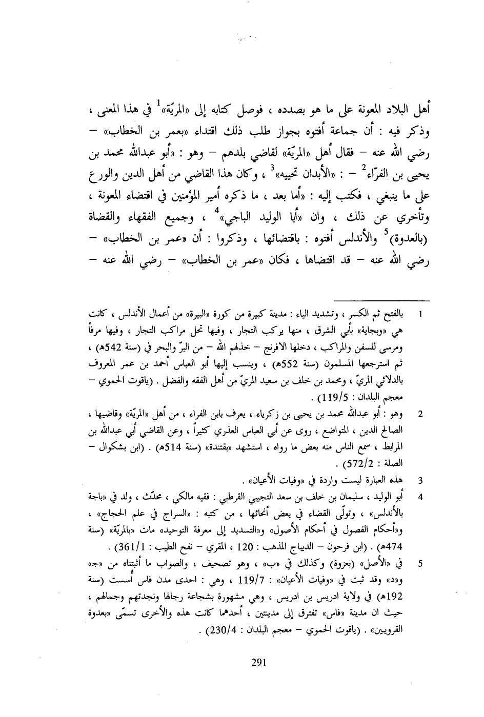أهل البلاد المعونة على ما هو بصدده، فوصل كتابه إلى "المريّة" 1 في هذا المعنى، وذكر فيه: أن جماعة أفتوه بجواز طلب ذلك اقتداء "بعمر بن الخطاب"- رضي الله عنه- فقال أهل "المريّة" لقاضي بلدهم- وهو: "أبو عبد الله محمد بن يحيى بن الفرّاء2 - : "الأبدان تحييه" 3، وكان هذا القاضي من أهل الدين والورع على ما ينبغي، فكتب إليه: "أما بعد، ما ذكره أمير المؤمنين في اقتضاء المعونة، وتأخري عن ذلك، وان "أبا الوليد الباجي" 4، وجميع الفقهاء والقضاة (بالعدوة) 5 والأندلس أفتوه: باقتضائها، وذكروا: أن "عمر بن الخطاب"- رضي الله عنه- قد اقتضاها، فكان "عمر بن الخطاب"- رضي الله عنه-
